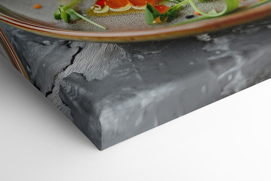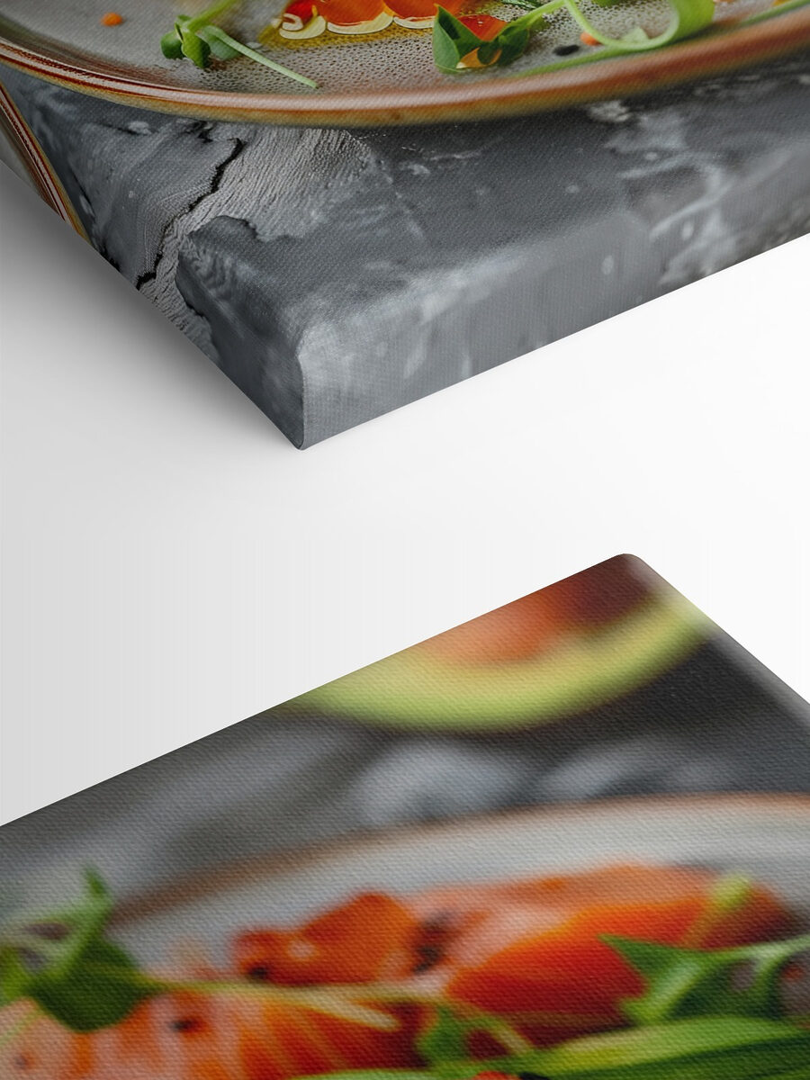 Transformați orice perete într-un deliciu culinar cu această imprimare uimitoare pe pânză, “Farfurie de mâncare pe o masă”. Imaginați-vă că intrați în bucătărie sau în zona de luat masa și acolo este – un festin vizual apetisant de somon proaspăt și avocado vibrant, aranjate artistic. E ca și cum mâncarea vă zâmbește! Perfect pentru gurmanzi sau pentru oricine apreciază culorile îndrăznețe și prezentările frumoase. Această piesă adaugă un strop de eleganță în timp ce stârnește acele pofte delicioase. Nu este doar decor; este o invitație de a savura fiecare moment, poate chiar de a inspira o cină sau două. Cine nu și-ar dori acest delicios strop de aromă pe pereți?