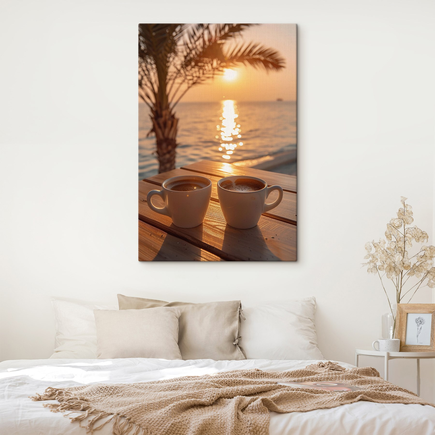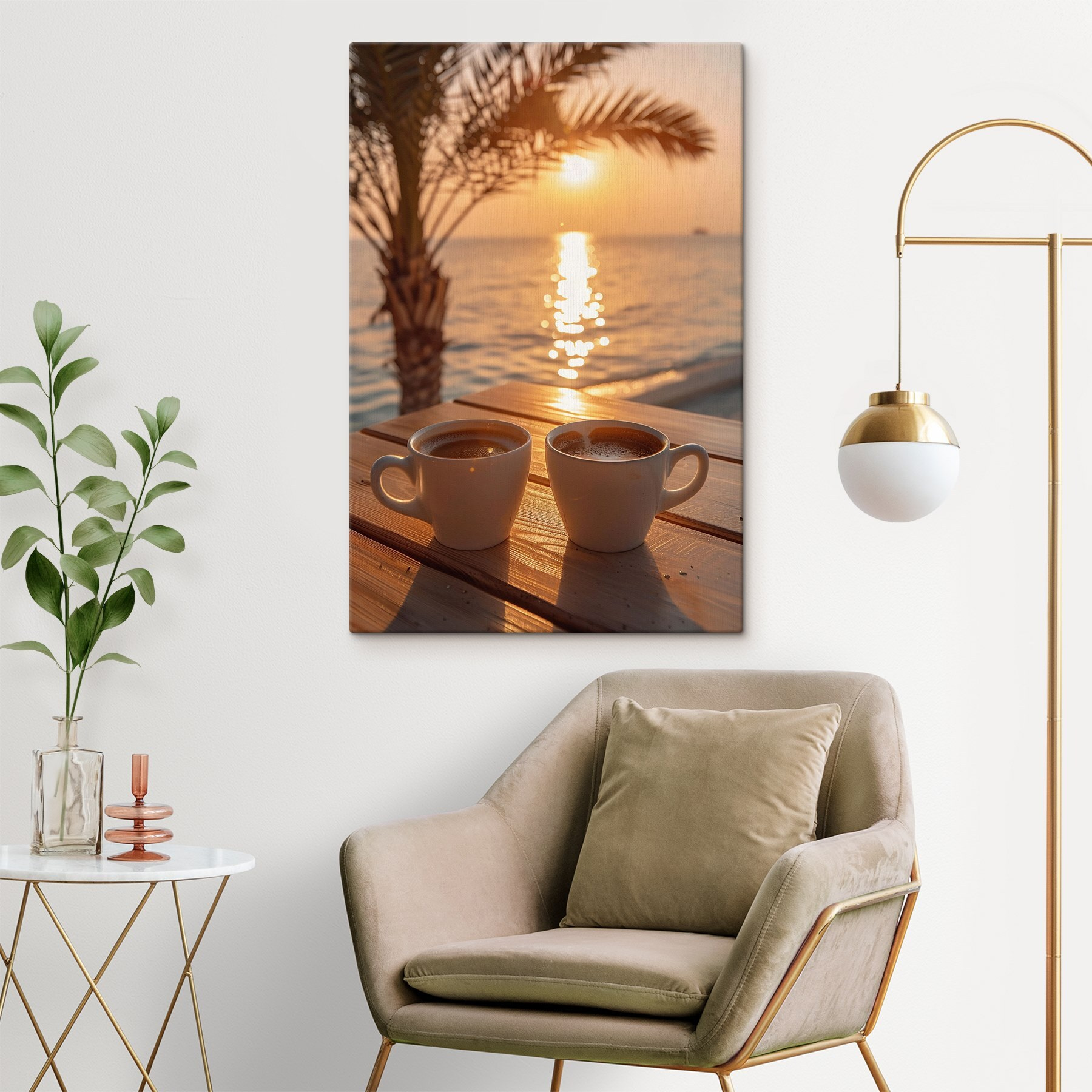 Imaginați-vă că vă treziți în lumina blândă a răsăritului care se revarsă peste ocean și două cești aburinde de cafea care abia așteaptă să fie sorbite. Acest print pe pânză surprinde acel moment perfect de liniște, în care timpul pare să încetinească. Este ca și cum ai avea o mini-vacanță chiar pe perete, invitând la discuții pe îndelete sau la ritualuri de dimineață liniștitoare. Reflexiile blânde de pe apă adaugă un vibe de vis, făcând orice spațiu să se simtă confortabil și primitor. Perfect pentru un iubitor de cafea sau pentru oricine dorește o notă de seninătate la domiciliu. Cine nu și-ar dori să zăbovească în acea scenă puțin mai mult?