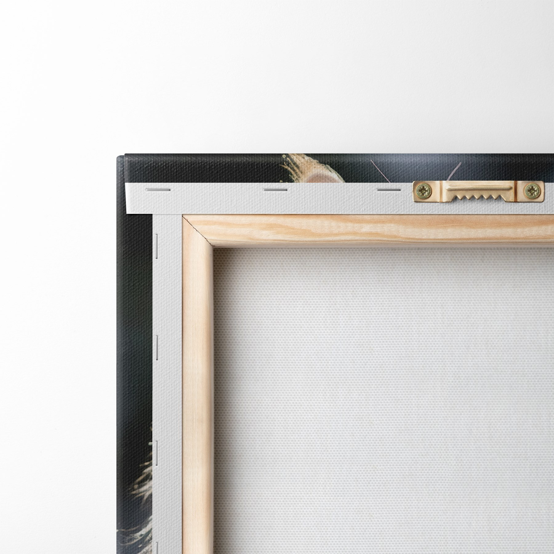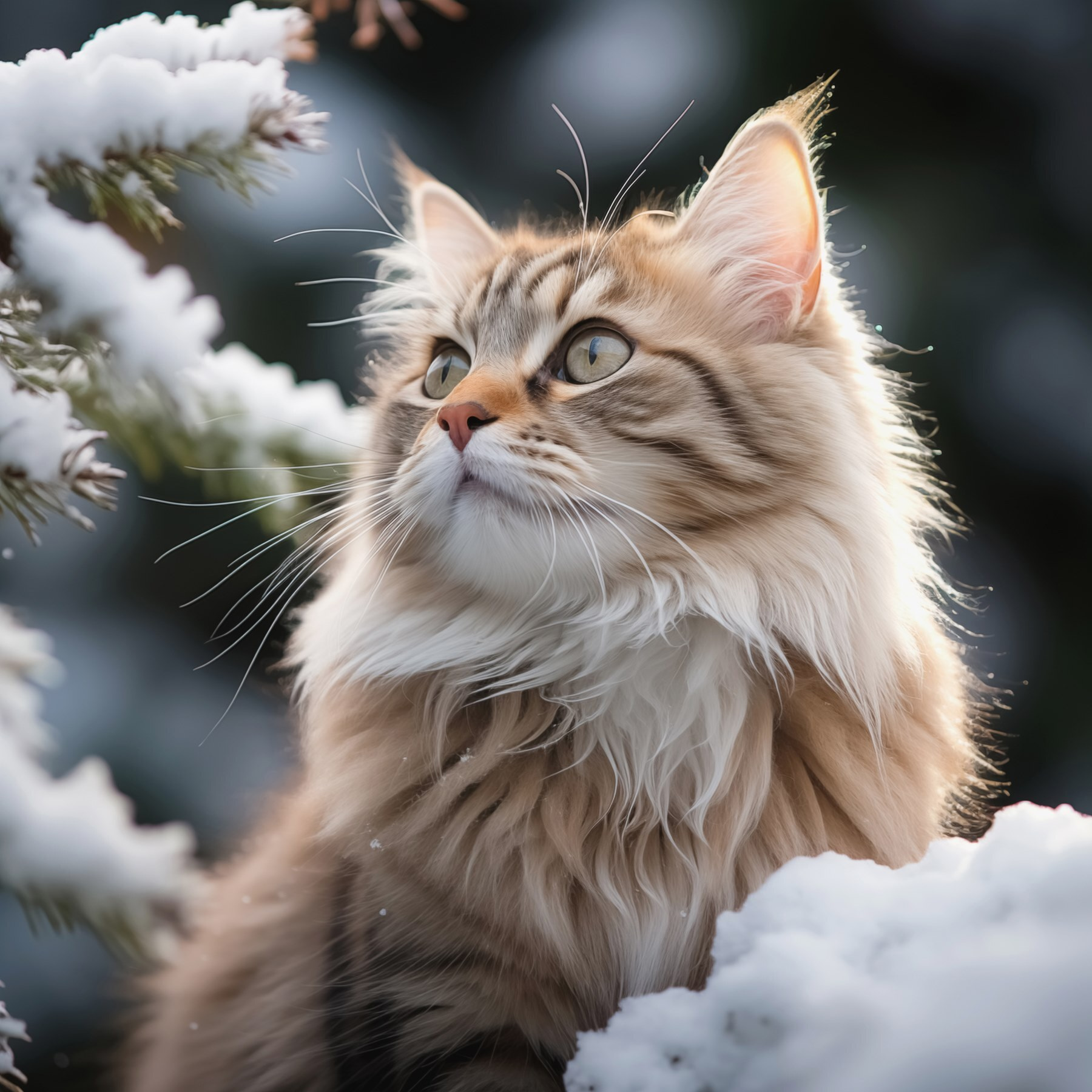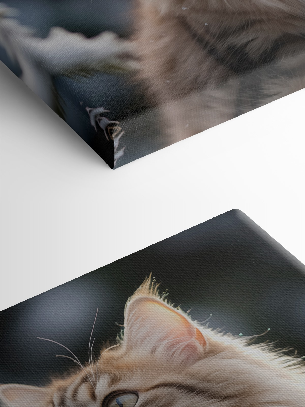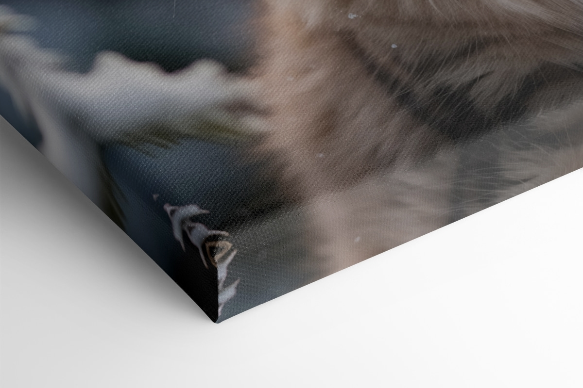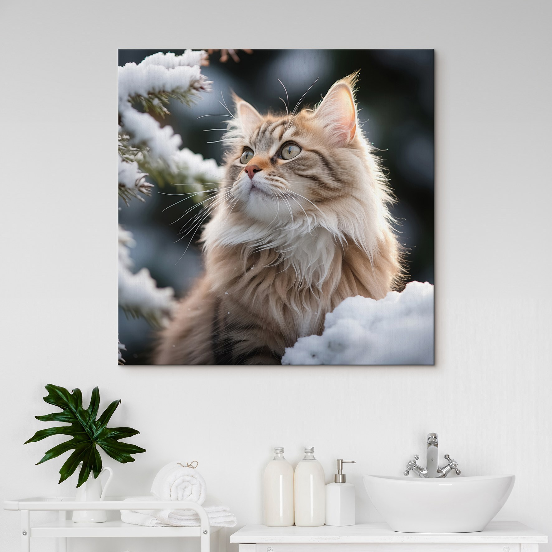 Vă prezentăm o imprimare încântătoare pe pânză cu o pisică maiestuoasă așezată în zăpada moale și strălucitoare. Imaginați-vă acest superstar pufos așezat în camera dvs. de zi, adăugând un aer de fantezie și căldură. Ochii săi mari și curioși par să se uite direct la tine, invitându-te într-o țară a minunilor înghețată.