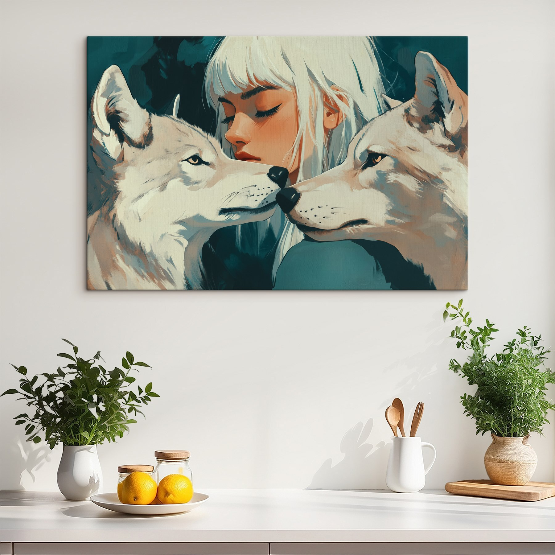 Pășește într-o lume a frumuseții sălbatice cu această imprimare uimitoare pe pânză, care înfățișează o femeie captivantă cu păr alb și fluid și doi lupi izbitoare. Este ca o scenă desprinsă dintr-un basm, nu-i așa? Privirea tandră împărtășită între cei doi pare aproape magică, invitându-vă în lumea lor secretă. Imaginați-vă că agățați această piesă în camera de zi sau în bârlogul dvs. confortabil – prietenii se vor opri cu siguranță să o admire. Această operă de artă nu doar decorează; stârnește imaginația și scoate la iveală povestitorul din fiecare. Lăsați energia fermecătoare a naturii sălbatice să inspire nenumărate conversații și visări cu ochii deschiși. Este mai mult decât o imprimare; este o vibrație care șoptește povești de aventură și conexiune. Perfectă pentru cei care apreciază frumusețea din natură și legătura dintre oameni și animale. Haideți, lăsați pereții dvs. să spună o poveste!