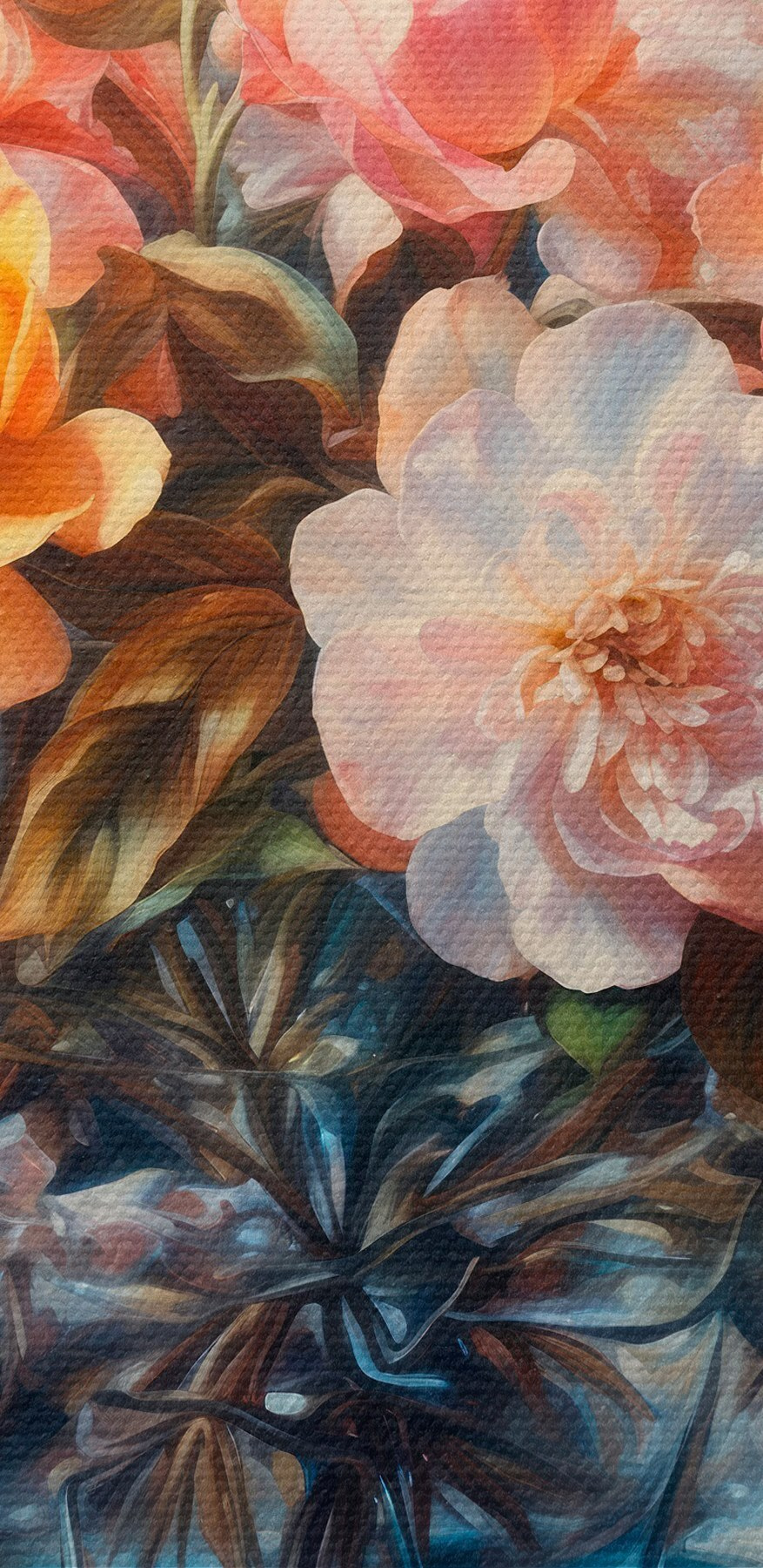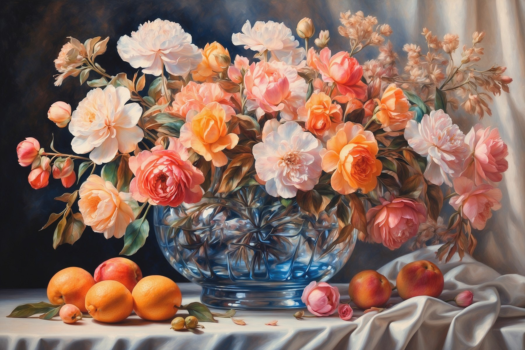 Înveseliți orice cameră cu această imprimare uimitoare pe pânză, “Pictură de flori într-o vază de sticlă”. Este ca și cum ai aduce o grădină direct în spațiul tău de locuit, fără polenul deranjant. Florile luxuriante în tonuri moi de piersică și roz dansează practic pe pânză, invitând zâmbete și căldură. Imaginați-vă această frumusețe deasupra canapelei dvs. sau într-un colț de lectură confortabil, creând atmosfera perfectă pentru discuții lungi sau momente liniștite cu o carte bună. În plus, acele portocale și mere superbe de la bază? Pur și simplu strigă proaspăt și primitor. Este o piesă care spune o poveste, transformând fiecare privire într-o mini evadare. Perfectă pentru oricine dorește să adauge o notă de natură și un strop de farmec decorului său!