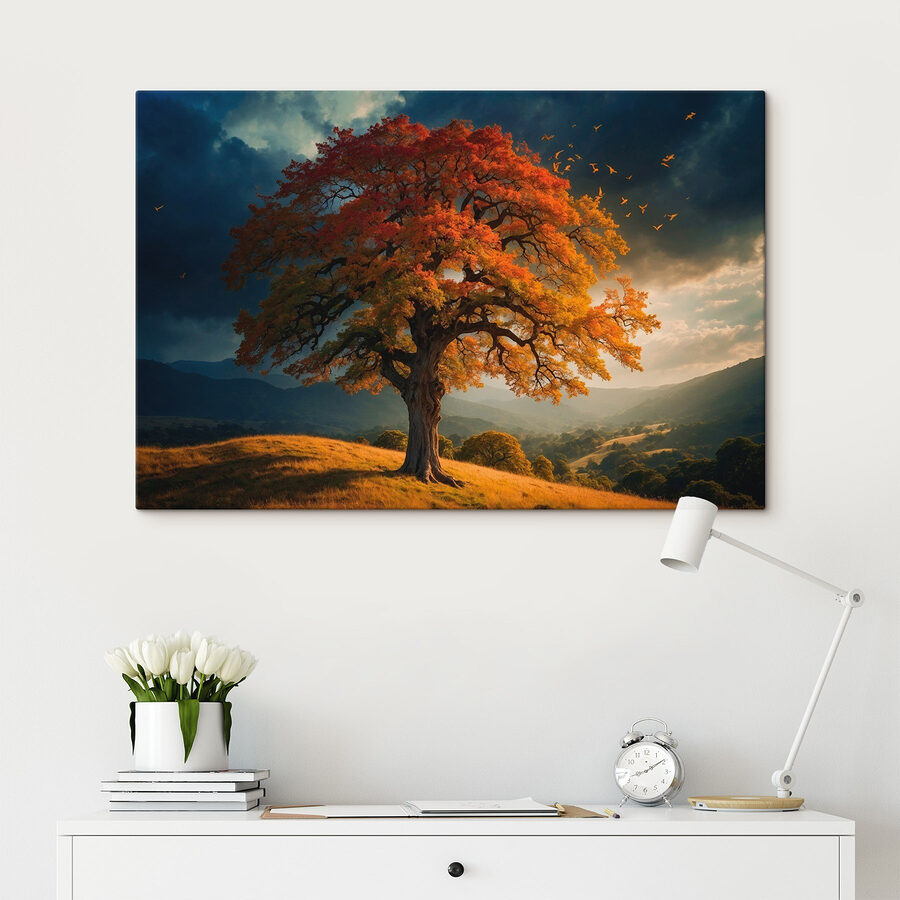 Transformați orice spațiu cu această imprimare uimitoare pe pânză a unui copac maiestuos drapat în frunze portocalii și galbene, care stă mândru pe un deal. Este ca o îmbrățișare caldă din partea toamnei, aducând o explozie de culoare și viață pereților dvs. Imaginați-vă sorbind cafea în timp ce priviți această piesă vibrantă, simțind acele vibrații confortabile de toamnă pe tot parcursul anului. Nu este doar un decor – este o invitație de a visa cu ochii deschiși la drumeții liniștite și la frunze crocante sub picioare. Perfectă pentru orice cameră, această operă de artă emană căldură și o notă de fantezie. Cine nu ar zâmbi la asta?