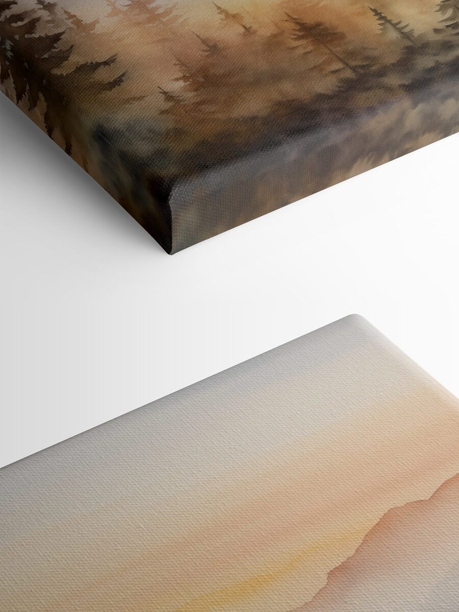 Intrați într-o evadare de vis cu această imprimare pe pânză acuarelă a unei păduri și a unor munți. Imaginați-vă strălucirea caldă a unui apus de soare învăluind spațiul dvs. în liniște, în timp ce ceața moale dansează în jurul copacilor înalți. Este ca și cum ai aduce o felie de natură chiar în sufrageria ta – perfect pentru momentele în care o plimbare afară nu este în cărți. Imaginați-vă cum vă relaxați cu o băutură caldă, privind această piesă și simțind cum stresul se topește. Fie că este un punct central deasupra canapelei sau un accesoriu confortabil într-un colț de lectură, această operă de artă invită la seninătate și la o notă de aventură. Cine nu și-ar dori asta?