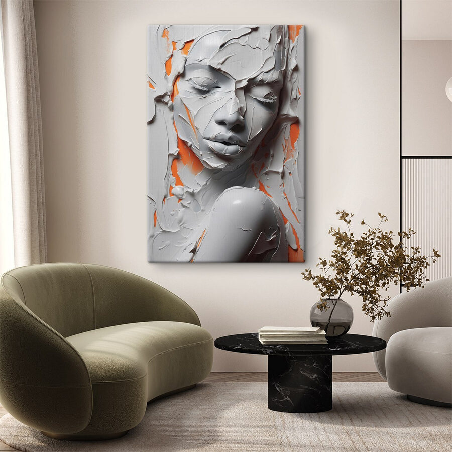 Scufundați-vă într-o lume în care frumusețea întâlnește misterul cu acest print pe pânză. Imaginea izbitoare a feței unei femei, învăluită într-un strat neted de vopsea albă, captează atenția și stârnește curiozitatea. Este ca o pauză grijulie într-o zi agitată – un moment care invită la reflecție. Imaginați-vă această piesă vibrantă agățată într-un colț confortabil sau într-o cameră de zi modernă, stârnind conversația la cafea sau contemplarea liniștită în timpul unei seri de relaxare. Portocaliul cald care iese la iveală adaugă doza potrivită de prospețime, făcând din această piesă mai mult decât o simplă artă – este o gură de aer proaspăt pentru orice spațiu. Cu siguranță, o apariție de neuitat!
