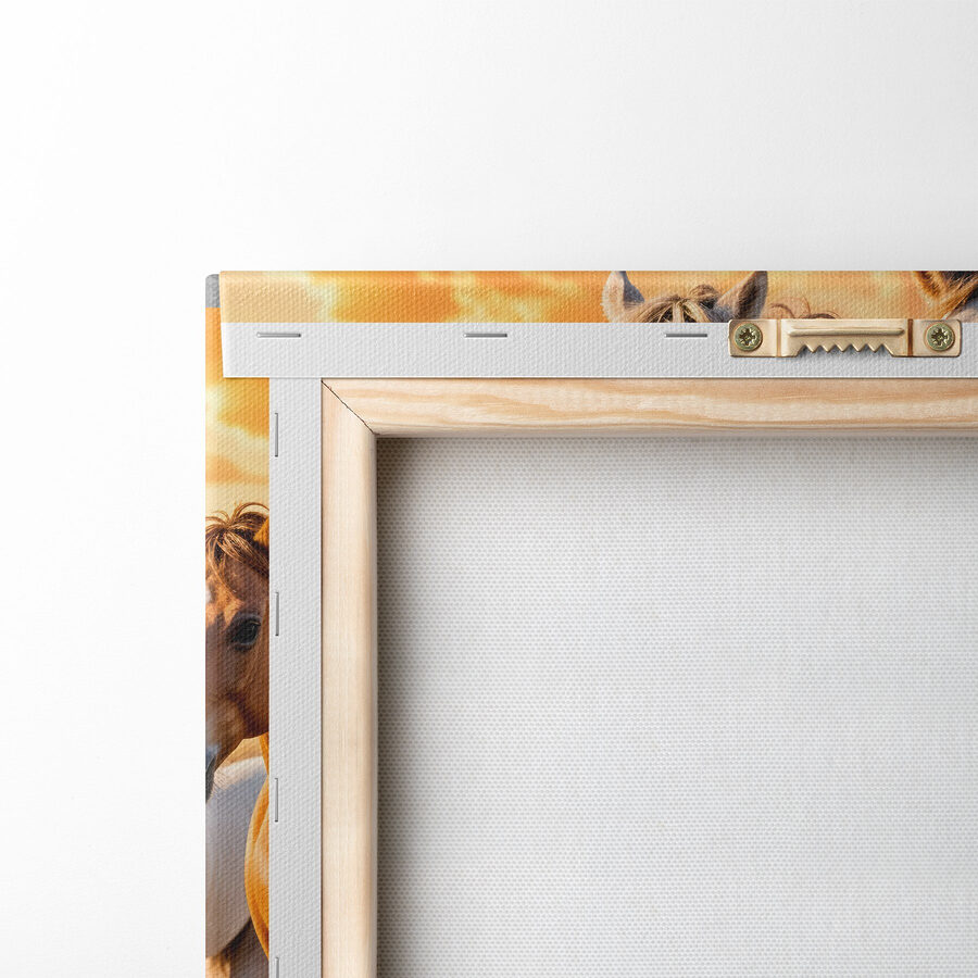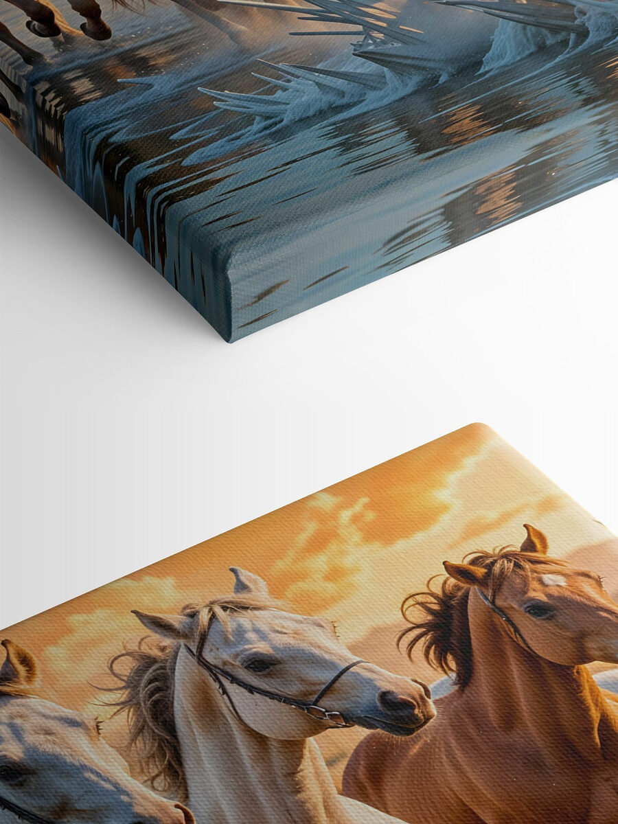 Scufundați-vă într-o lume în care sălbăticia se întâlnește cu seninătatea cu această imprimare uimitoare pe pânză a cailor galopând prin apă. Imaginați-vă sunetul copitelor stropind, soarele apunând în spatele lor și acea grabă a libertății plutind în aer. Acesta aduce un sentiment de aventură chiar în camera dvs. de zi. Această operă de artă face minuni deasupra unei canapele confortabile sau luminează un hol, stârnind zâmbete și discuții despre marea viață în aer liber. Perfectă pentru oricine iubește un strop de natură, este ca și cum ai avea o felie din galopul unui apus de soare chiar la tine acasă, gata să inspire visări și povești.