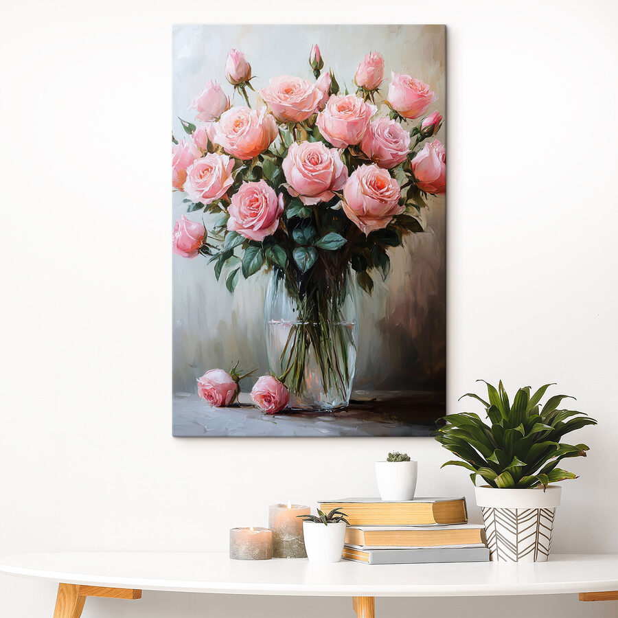 Înveseliți orice cameră cu această imprimare uimitoare pe pânză cu trandafiri roz într-o vază. Este ca o mică explozie de primăvară, chiar și în mijlocul iernii! Imaginați-vă că treceți pe lângă ea și simțiți o adiere de fericire florală – bine, poate că nu miroase, dar cu siguranță arată primitor. Nuanțele moi de roz și verdele luxuriant creează o atmosferă liniștitoare, perfectă pentru un colț de lectură confortabil sau o bucătărie optimistă. În plus, este o sursă excelentă de conversație – cui nu-i place să discute despre flori? Această piesă șoptește căldură, farmec și doar un strop de romantism. Oricine o vede se va simți un pic mai fericit, garantat!