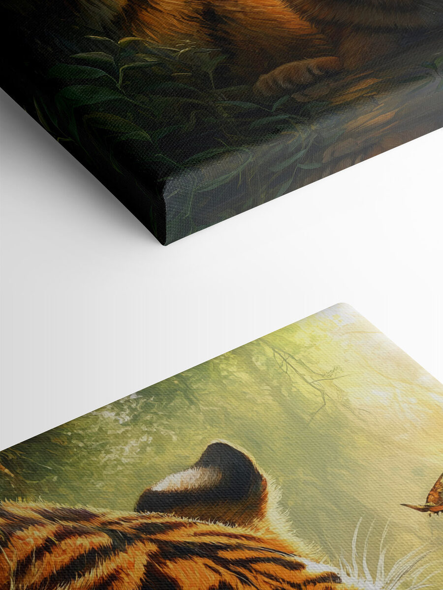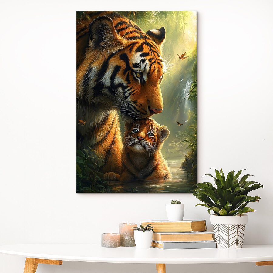 Scufundați-vă în sălbăticie cu această imprimare uimitoare pe pânză cu un tigru și puiul său adorabil, perfect cuibărit într-o scenă de junglă luxuriantă. Privirea micului pui de tigru atinge coardele inimii, nu-i așa? Imaginați-vă această piesă decorând un colț confortabil, stârnind conversații și poate chiar câteva vise cu ochii deschiși la safari și trasee însorite. Culorile vibrante aduc un strop de natură în interior, amintindu-le tuturor de frumusețea din fața ușilor noastre. Este ca și cum ai avea o bucățică din sălbăticie chiar în casa ta! Perfect pentru iubitorii de animale sau pentru oricine dorește să adauge un farmec fioros decorului său. În plus, cine nu ar dori o doză zilnică de drăgălășenie?