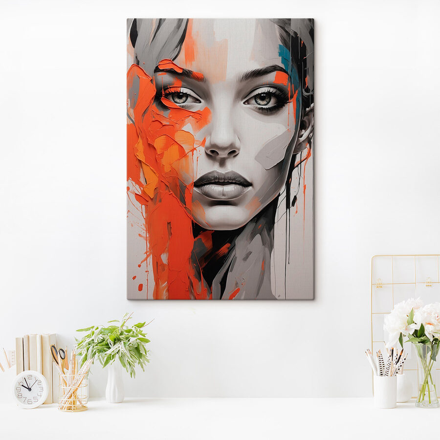 Acest print pe pânză este ca un strop de personalitate pe peretele tău. Imaginați-vă o femeie izbitoare cu vopsea portocalie vibrantă pe față, capturând acel spirit îndrăzneț de care toți avem nevoie din când în când. Nu este doar artă; este o vibrație. Contrastul dramatic dintre trăsăturile ei și culorile vii te atrage, stârnind conversații și poate chiar un pic de inspirație. Așezați acest tablou într-un colț de lectură confortabil sau în sufrageria dvs. plină de viață? Farmec instantaneu. Perfect pentru oricine iubește să îmbine pasiunea cu o notă de stil modern. Cine nu ar zâmbi la asta?