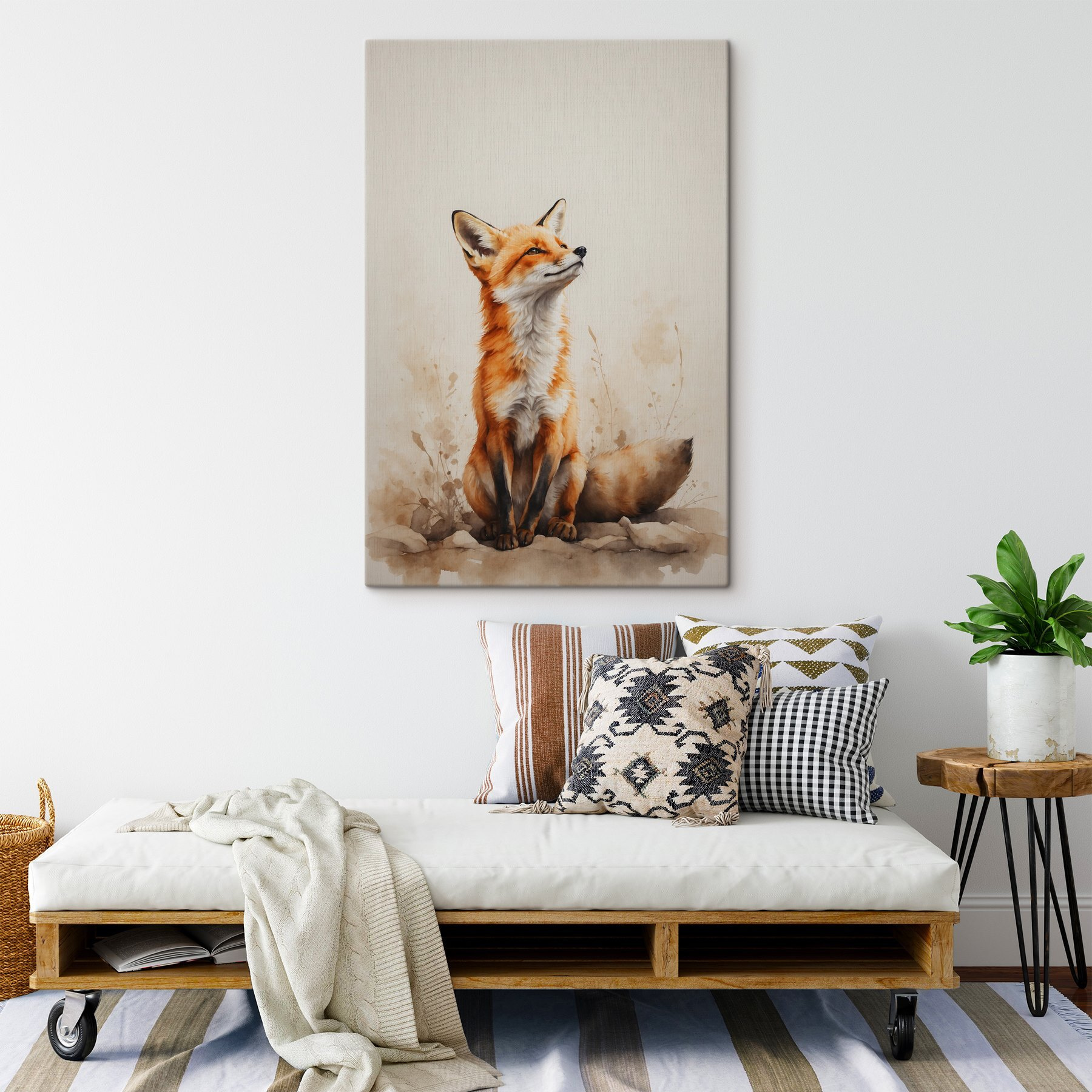 Aduceți un strop de farmec pereților dvs. cu această imprimare încântătoare pe pânză a unei vulpi, care privește lumea cu o expresie jucăușă, dar înțeleaptă. Este ca și cum ai avea o bucățică de natură îmbrățișată chiar în spațiul tău de locuit. Imaginați-vă cum acest print ar putea transforma un colț plictisitor – dintr-o dată, acesta este plin de viață și personalitate. Portocalele calde și acuarelele moi invită la o atmosferă confortabilă, perfectă pentru a vă cuibări cu o carte bună sau pentru a sta de vorbă cu prietenii. Nu este doar decor; este un mic starter de conversație. Adaugă o notă de fantezie casei tale – pentru că cine nu vrea o vulpe elegantă care să vegheze?