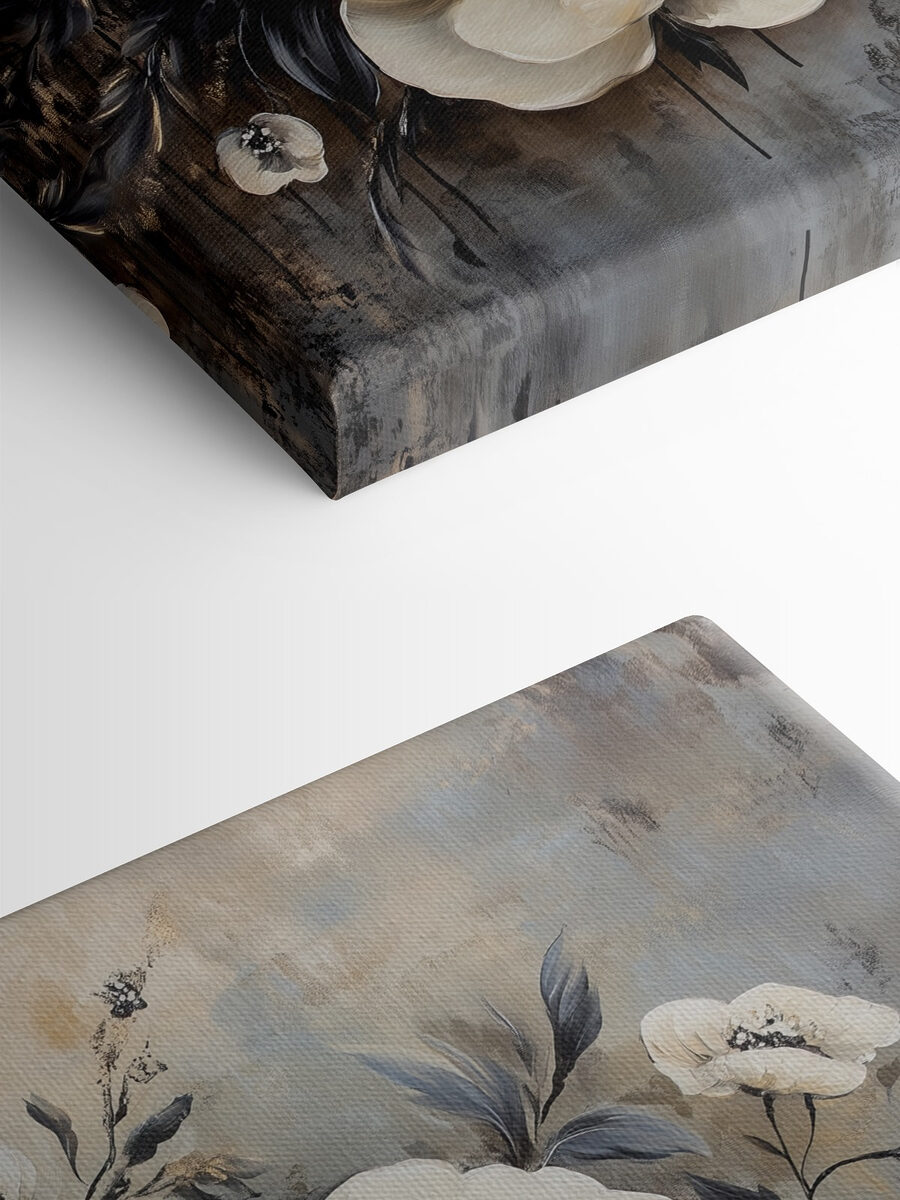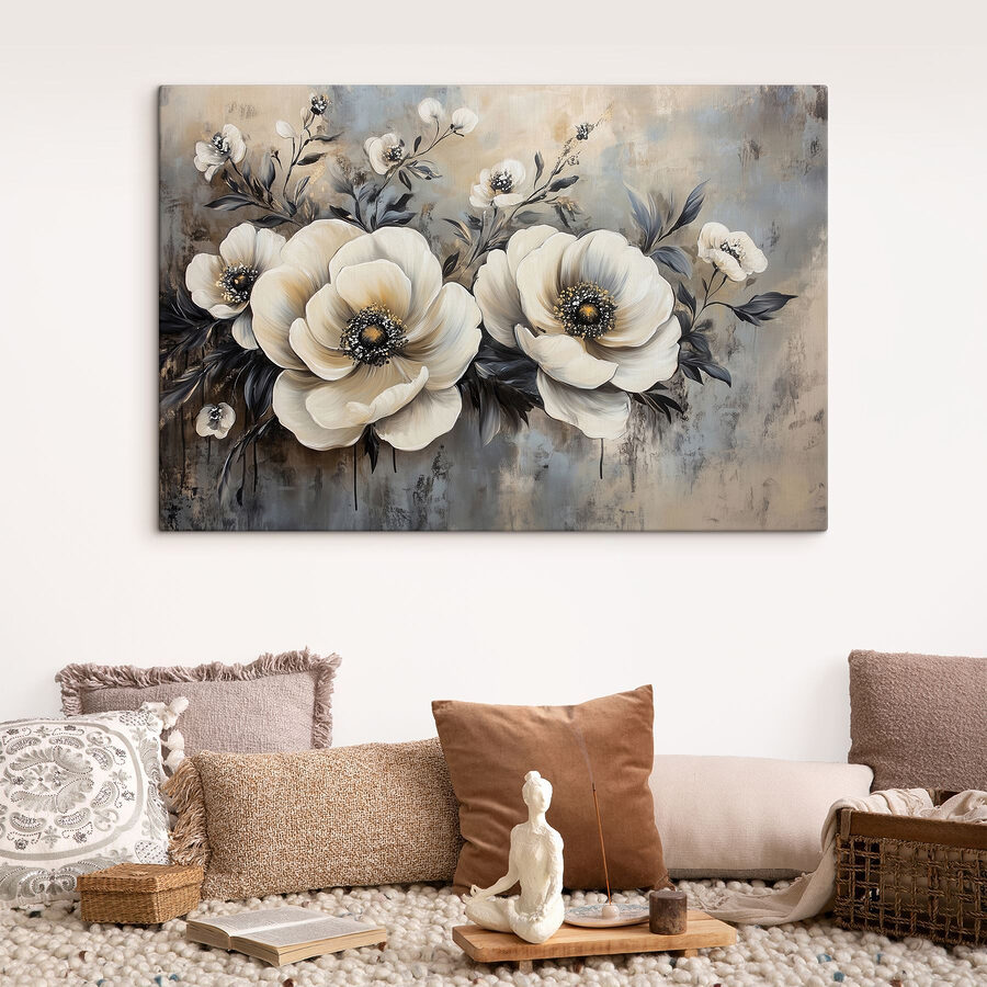 Transformați-vă spațiul cu această imprimare uimitoare pe pânză de flori albe delicate. Acesta aduce o notă de natură în interior, fără a fi nevoie de un deget verde – vorbește despre un câștig! Imaginați-vă că intrați într-o cameră și sunteți întâmpinați de aceste flori moi, care șoptesc ușor un sentiment de calm și liniște. Fiecare floare pare să spună propria sa poveste, perfectă pentru a stârni conversații în timpul întâlnirilor confortabile. Tonurile neutre se îmbină fără efort, completând orice stil de decor. Fie că se află deasupra canapelei sau într-un birou acasă, această piesă este ca o gură de aer proaspăt. Doar nu uitați să o udați cu complimente!