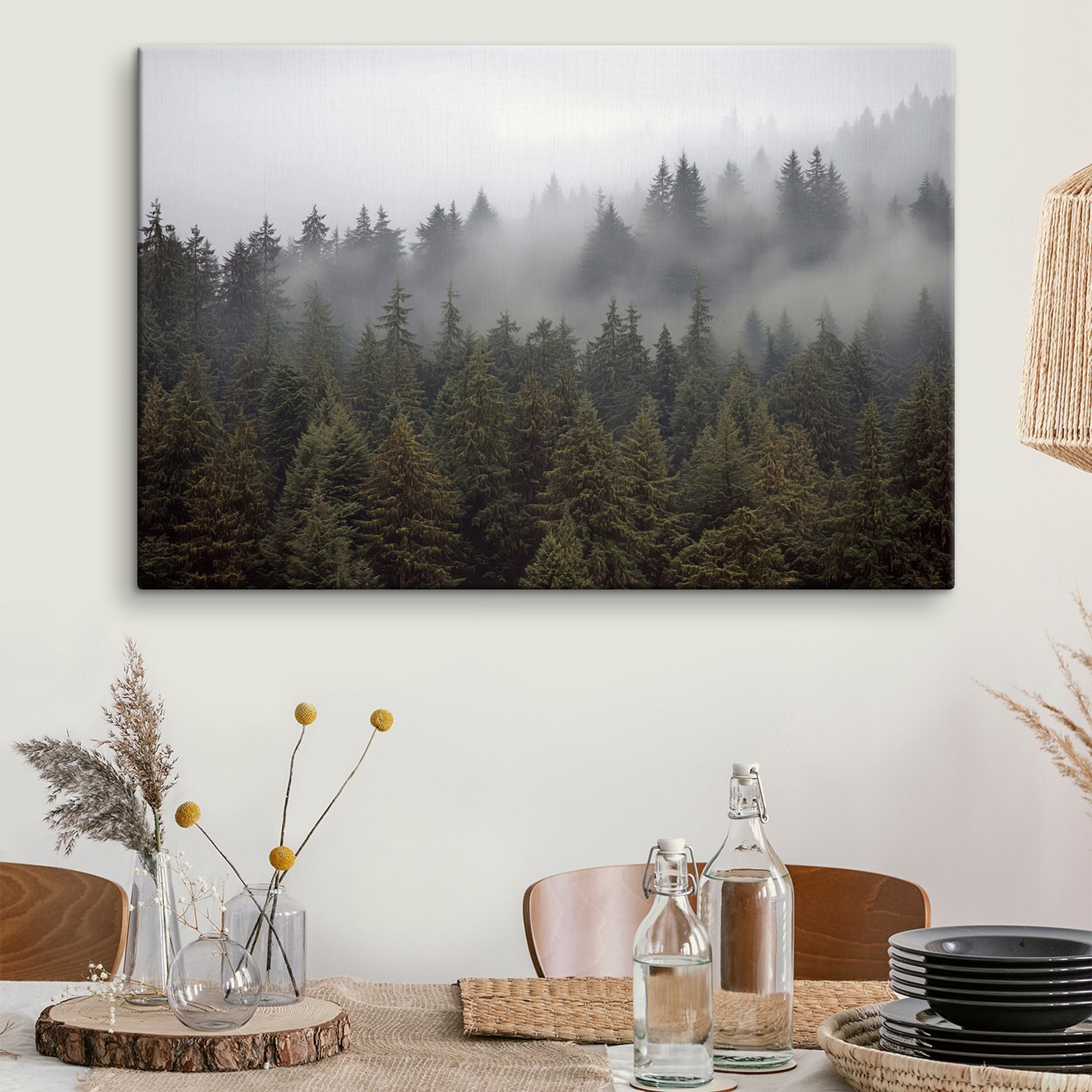 Transformați orice spațiu cu această încântătoare “Tablouri: Grup de copaci cu ceață”. Imaginați-vă că vă plimbați printr-o pădure cețoasă, mirosul proaspăt de pin umplând aerul, în timp ce ceața moale se împletește printre copaci. Această operă de artă surprinde perfect această atmosferă de vis. Este ca și cum ai invita natura chiar în casa ta, mai puțin țânțarii!