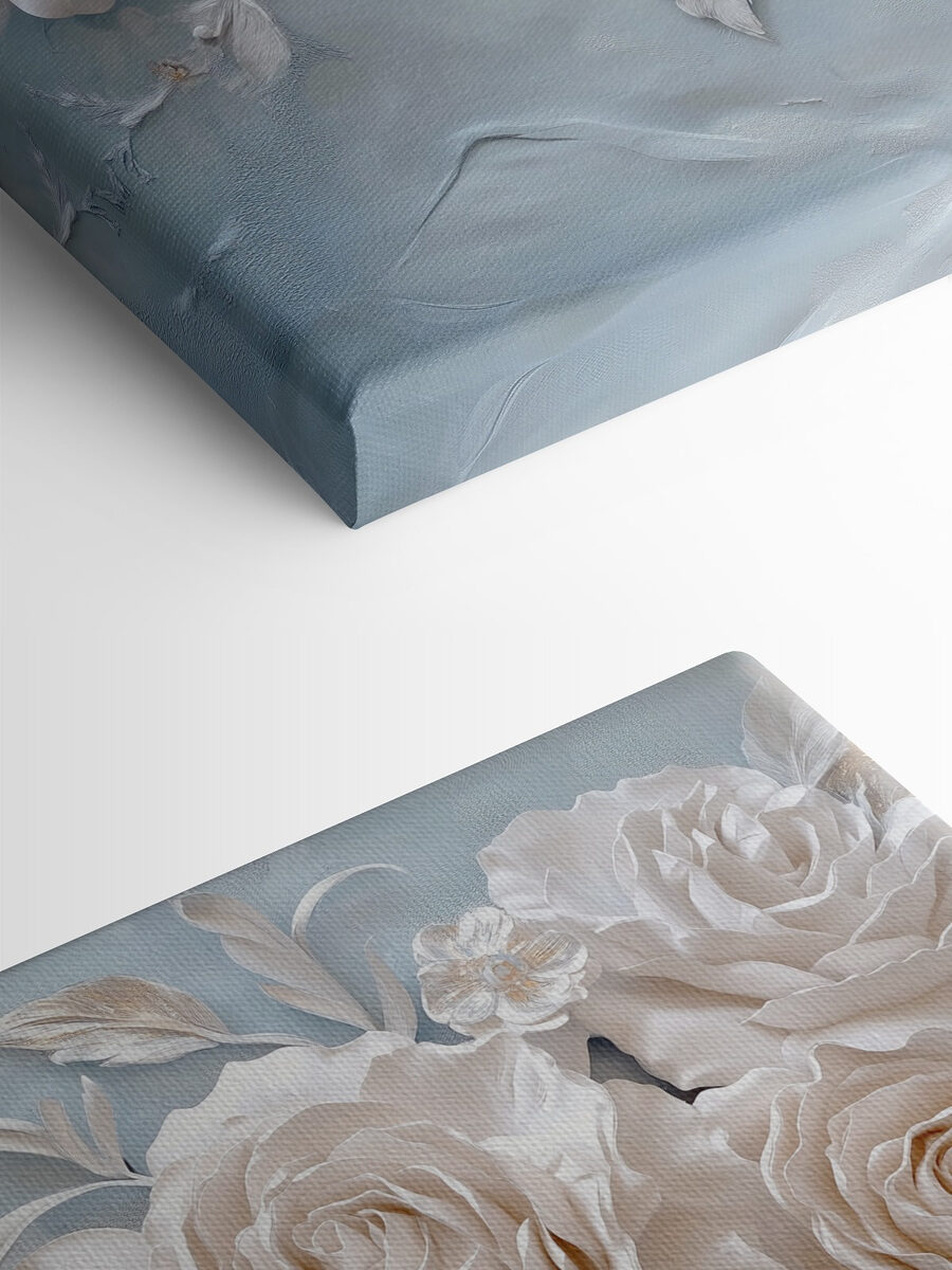 Transformați orice cameră cu această imprimare uimitoare pe pânză, “Flori și frunze albe pe o suprafață albastră”. Imaginați-vă o dimineață liniștită în care lumina soarelui pătrunde, luminând acele flori elegante care par să danseze pe perete. Fundalul albastru moale evocă vibrații calme, perfecte pentru un colț de lectură confortabil sau un dormitor senin. Este ca și cum ai aduce o felie de natură în interior – fără a mai fi nevoie de udare! O notă de rafinament, un strop de fantezie și atât de primitoare. Prietenii s-ar putea să-ți complimenteze gusturile fantastice! Deci, de ce să așteptați? Lăsați florile să vă lumineze spațiul și inima.