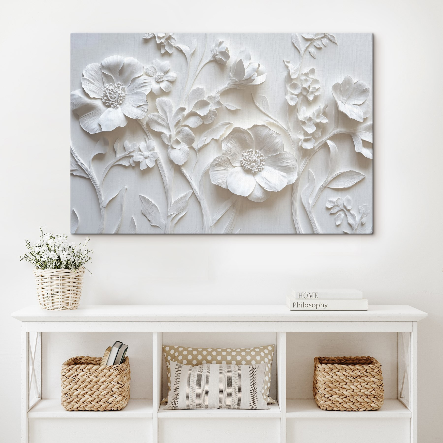 Transformarea unui perete gol într-o oază vibrantă tocmai a devenit mai ușoară cu această imprimare pe pânză cu flori fermecătoare. Imaginați-vă aceste flori delicate înveselind o cameră de zi sau o cameră confortabilă – este ca și cum ați aduce o felie de natură în interior, fără a fi nevoie să o udați! Tonurile moi, neutre se îmbină fără efort cu orice decor, fiind o piesă versatilă care poate uni frumos o cameră. Este perfectă pentru cei care apreciază o notă de eleganță fără a fi prea ostentativă. Fiecare privire aruncată asupra acestor flori vă poate aduce un zâmbet, amintindu-vă de zilele însorite și de brizele blânde. Ce nu e de iubit?