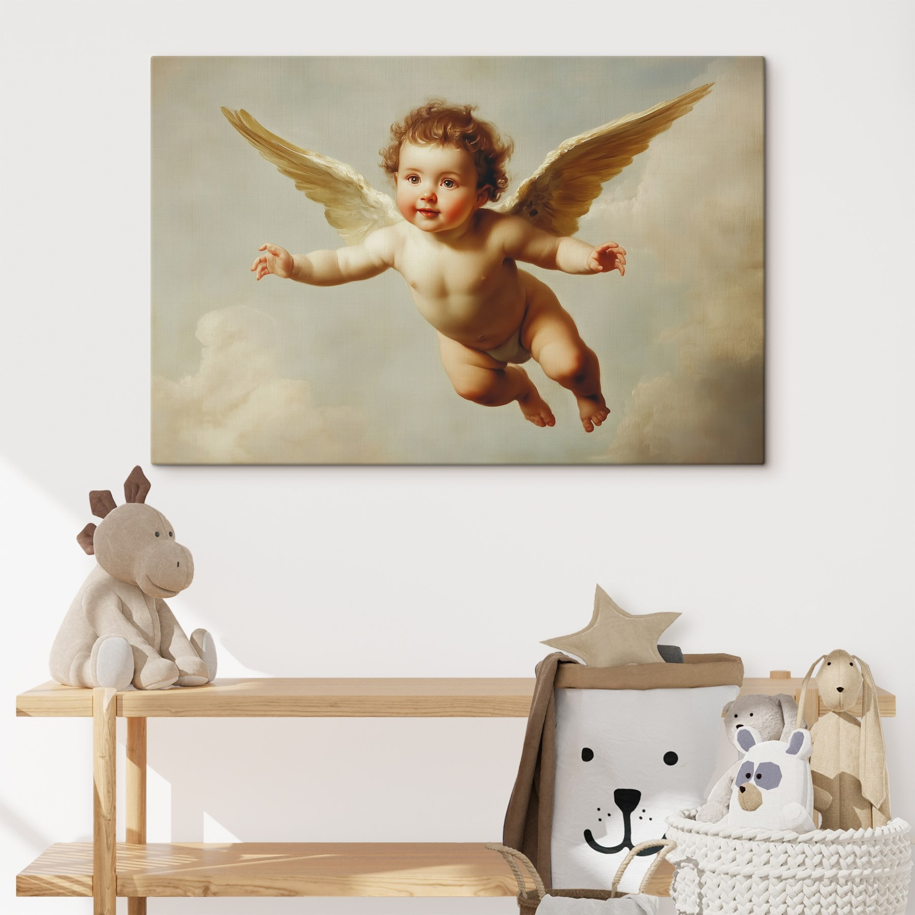 Faceți cunoștință cu “Tablouri Baby in the Sky”, o piesă încântătoare care adaugă un strop de magie oricărei camere. Imaginați-vă acest lucru: un bebeluș heruvim, cu aripile gata să zboare, plutind printre nori ca și cum ar fi doar o zi de marți obișnuită. Plasarea pe perete nu este doar un decor; este un starter de conversație înduioșător și o amintire blândă a inocenței. Stârnește sentimente de nostalgie, poate te face să te gândești la visele copilăriei sau la acel moment senin în care priveai norii plutind în derivă. Perfect pentru grădinițe sau pentru orice spațiu care are nevoie de o notă de fantezie, cu siguranță stârnește un zâmbet. Cine nu s-ar simți mai ușor uitându-se la asta? Este ca și cum ai avea un înger păzitor care se dublează ca artă – ce câștig!
