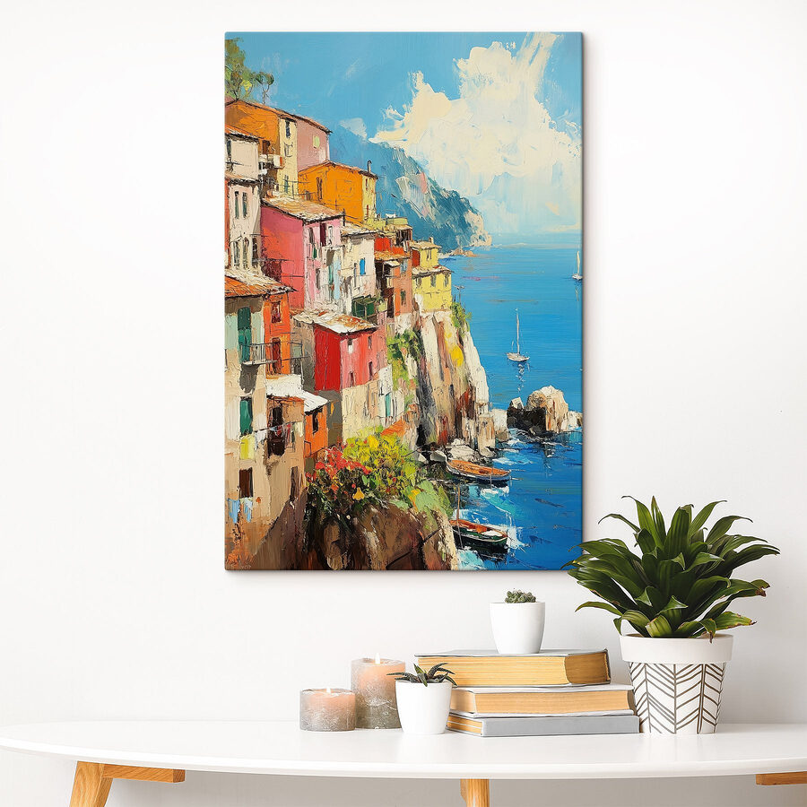 Transformați orice cameră într-o evadare confortabilă cu această imprimare pe pânză vibrantă a unui oraș fermecător cocoțat pe o stâncă pe malul mării. Aceste clădiri colorate par să danseze în lumina soarelui, ca și cum ar avea o mică petrecere a lor! Imaginați-vă sorbind cafea în timp ce priviți această scenă; aproape că puteți auzi valurile lovindu-se de stânci și simțiți briza caldă. Perfect pentru iubitorii de călătorii sau pentru oricine caută un strop de culoare în viața sa. Această piesă nu este doar artă; este o invitație la visare, la plimbare și poate, doar poate, la planificarea următoarei escapade.