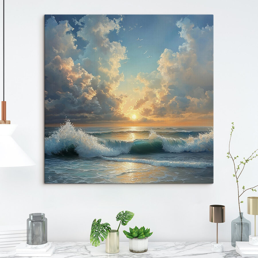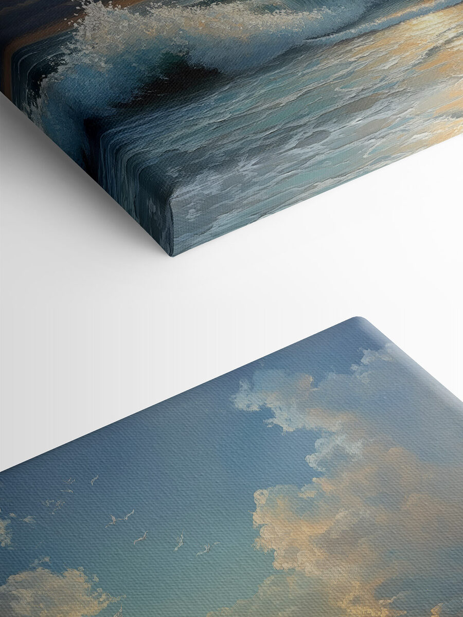 Imaginați-vă că stați pe țărm, cu valurile ciocnindu-se jucăuș de picioarele dvs. în timp ce soarele se ascunde în spatele orizontului. Această imprimare pe pânză surprinde acel moment senin, aducând frumusețea plajei chiar în spațiul dvs. de locuit. Este ca și cum ai avea o mini-vacanță pe perete – fără a fi nevoie de protecție solară. Albastrul vibrant și nuanțele blânde de apus de soare invită la visări cu ochii deschiși ale evadărilor de la malul mării și ale zilelor leneșe de plajă. Atârnă-l într-un colț confortabil și privește-ți prietenii cum se pierd în farmecul său liniștitor. Perfectă pentru oricine are nevoie de un strop de bucurie din natură, această piesă de artă șoptește vibrații dulci de evadare. Lasă-te purtat de ea, fie și numai pentru o clipă.