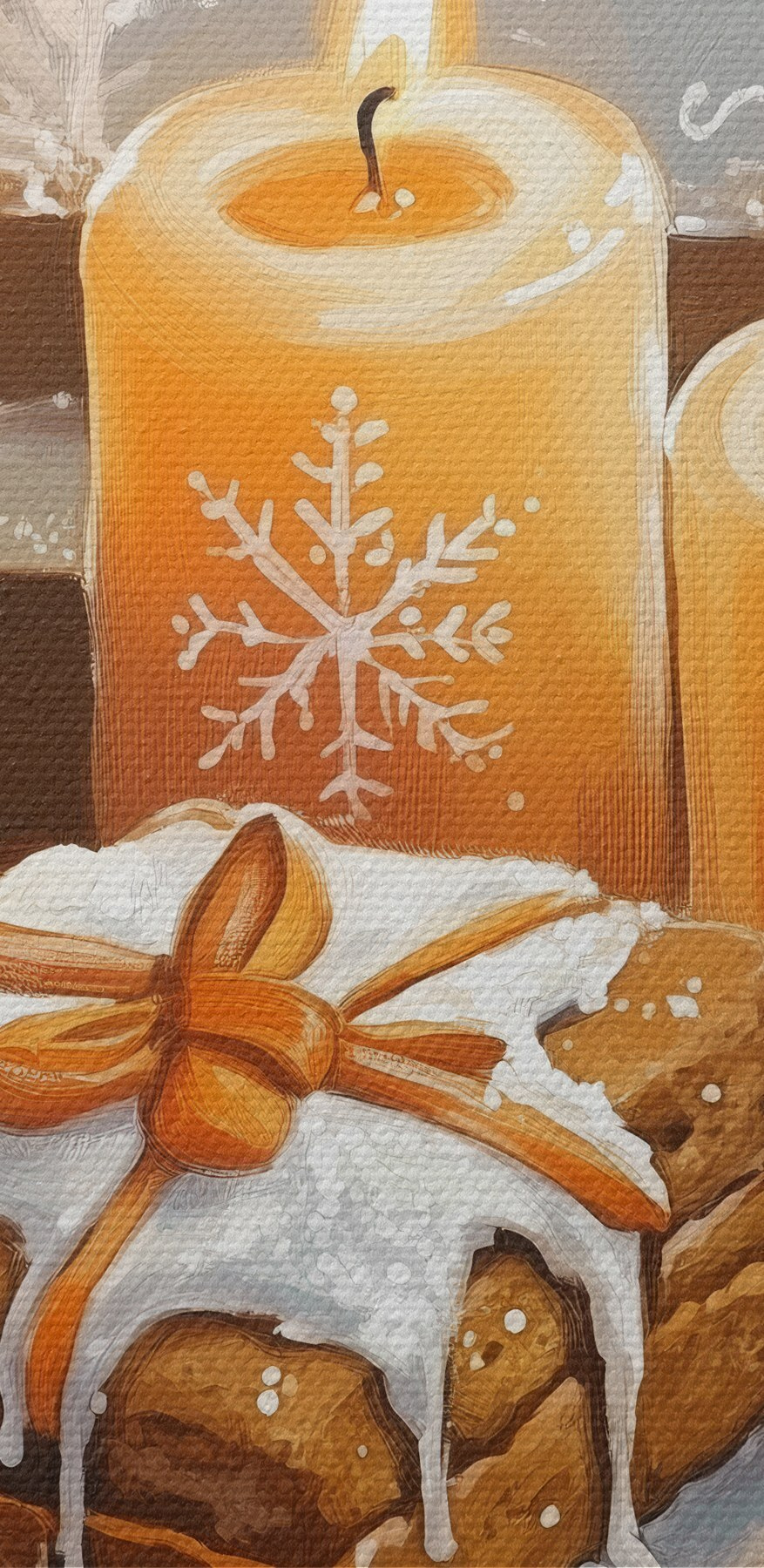 Transformați orice spațiu într-un refugiu confortabil cu această imprimare încântătoare pe pânză. Intitulat “Mâncare și lumânări pe o masă”, acesta surprinde atmosfera perfectă de iarnă – gândiți-vă la lumânările calde care pâlpâie, la bunătățile dulci care așteaptă să fie gustate și la aroma condimentelor care dansează în aer. Imaginați-vă sorbind cacao lângă foc, privind această scenă frumoasă și simțindu-vă instantaneu relaxați. Este ca și cum ai avea o discuție încântătoare cu prietenii fără să scoți un cuvânt. În plus, portocalele acelea? O explozie de culoare care invită pur și simplu la zâmbete. Perfectă pentru bucătării, săli de mese sau oriunde doriți să stârniți bucurie și confort. O amintire subtilă a faptului că, uneori, lucrurile simple – cum ar fi mâncarea bună și lumânările calde – fac viața atât de dulce.