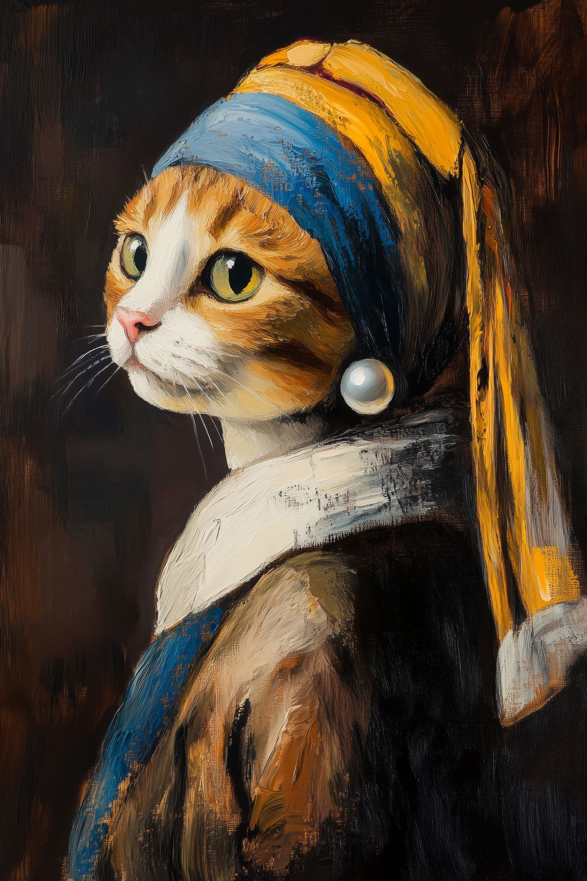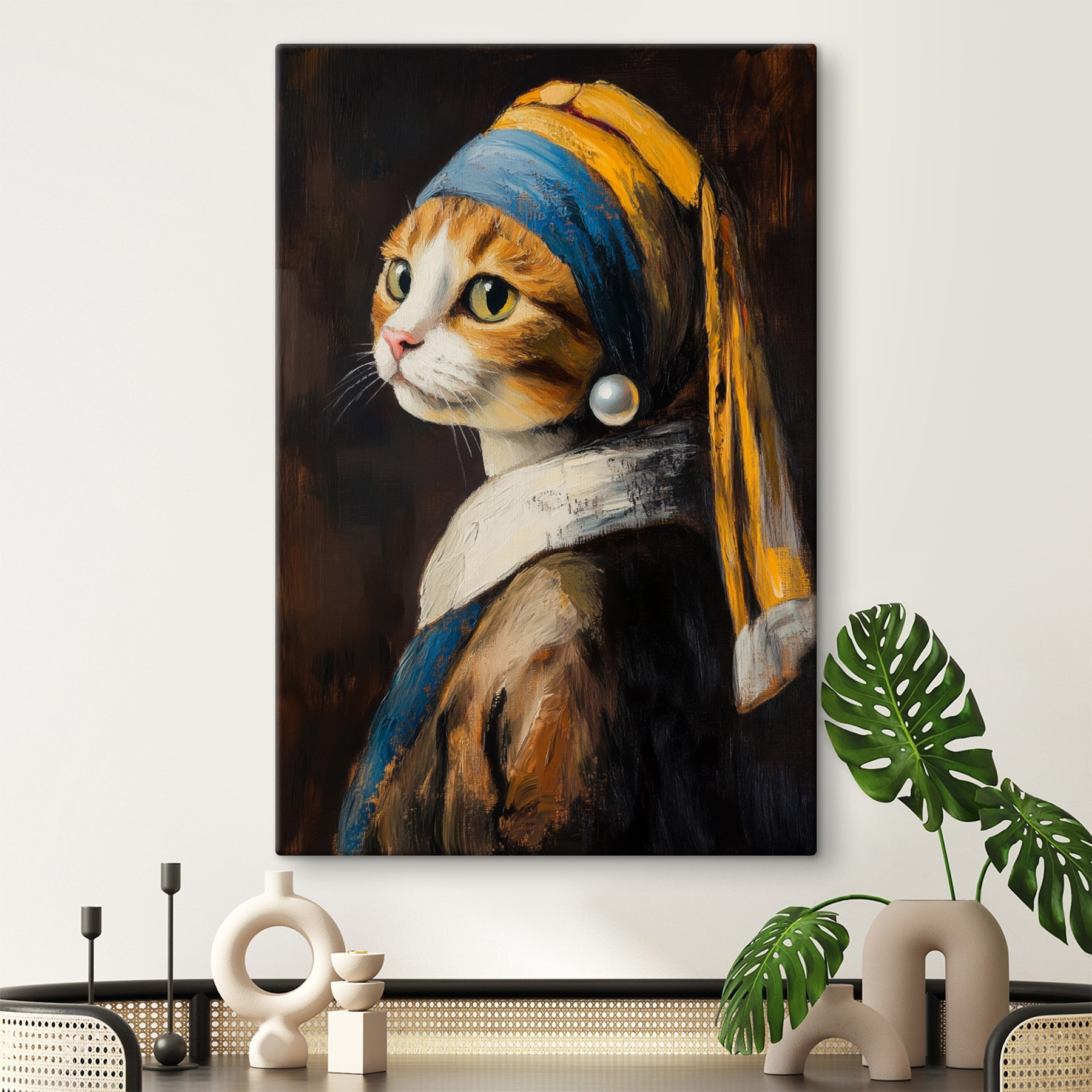 Această imprimare pe pânză plină de viață prezintă o pisică cu fler pentru modă, purtând o eșarfă clasică ca și cum ar fi pregătită pentru deschiderea unei galerii de artă. Imaginați-vă această piesă excentrică luminând un colț de lectură confortabil sau fiind vedeta camerei dvs. de zi. Amestecul acestor nuanțe calde și al acelei priviri captivante adaugă farmec și caracter, stârnind bucurie de fiecare dată când cineva se uită la ea. Este perfect pentru iubitorii de pisici sau pentru oricine apreciază o întorsătură încântătoare a artei clasice. Această felină are cu siguranță o personalitate – cine nu și-ar dori să discute cu o pisicuță atât de rafinată?