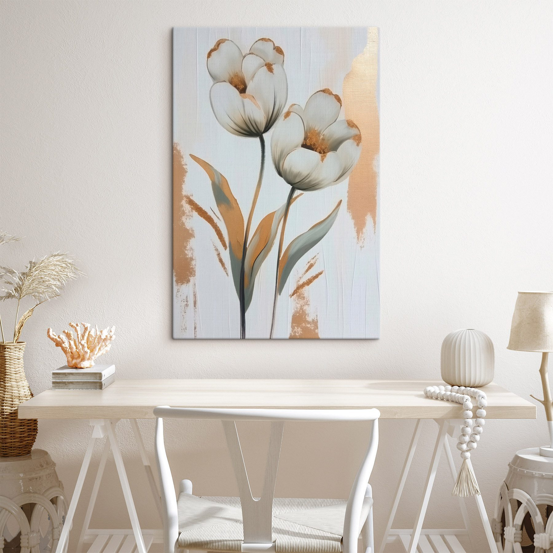 Înveselește-ți spațiul cu această imprimare uimitoare pe pânză cu flori delicate care dansează pe un fundal alb. Este ca și cum ai aduce o mică grădină în interior, fără stropitor și polen deranjant! Nuanțele blânde și liniile moi invită la un sentiment de calm, făcând-o perfectă pentru un living confortabil sau un dormitor senin. Imaginați-vă sorbind ceai sau cafea în timp ce priviți această capodoperă veselă – va stârni cu siguranță bucurie. În plus, se potrivește perfect cu toate tipurile de decor. Cine ar fi crezut că arta poate fi o modalitate atât de ușoară de a înălța o cameră?