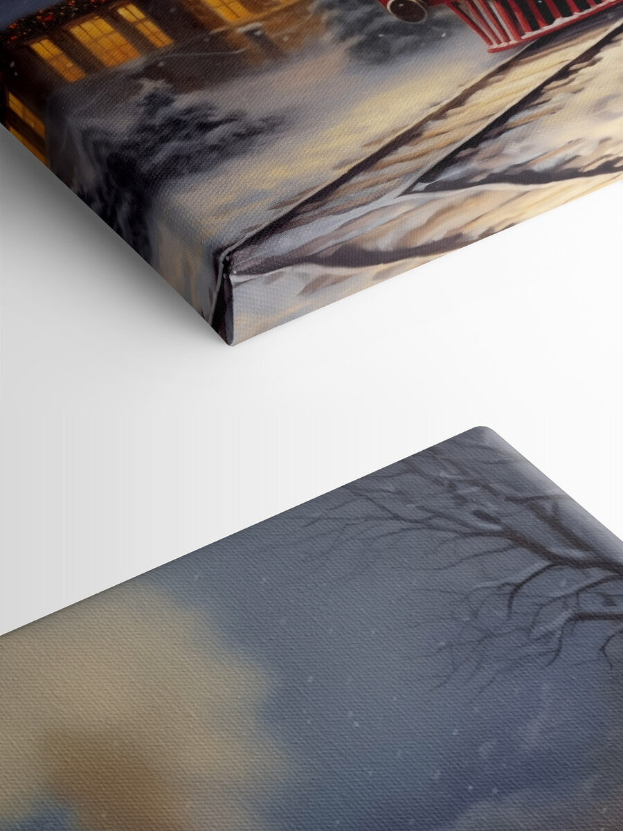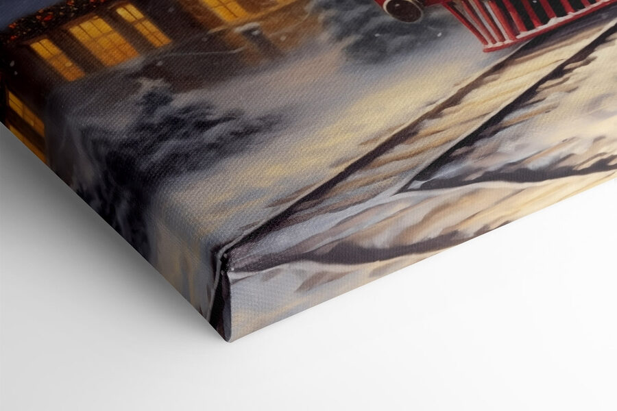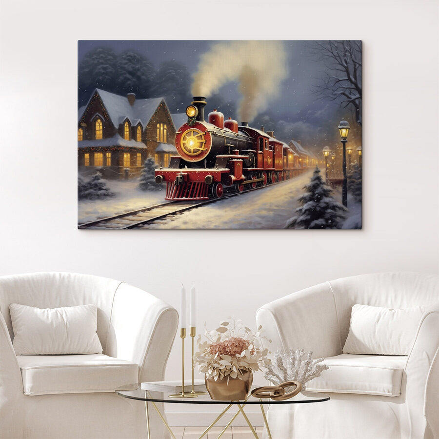 Imaginați-vă că vă așezați într-o cameră plină de liniștea blândă a zăpezii care cade și, dintr-o dată, sunteți purtat într-o altă epocă cu această imprimare încântătoare pe pânză. “Train on the Tracks in the Snow” surprinde farmecul unei locomotive cu aburi de epocă care trece pe lângă un sat pitoresc, acoperit de zăpadă. Strălucirea caldă de la ferestre vă urează bun venit acasă, în timp ce zăpada albă și moale acoperă totul la vedere. Atârnă-l și este ca și cum ai invita un mic tărâm al minunilor de iarnă în spațiul tău. Perfect pentru a stârni conversații sau pur și simplu pentru a evoca acea căldură nostalgică – pentru că cine nu iubește un pic de magie a trenului, mai ales atunci când este acoperit cu fulgi de zăpadă?