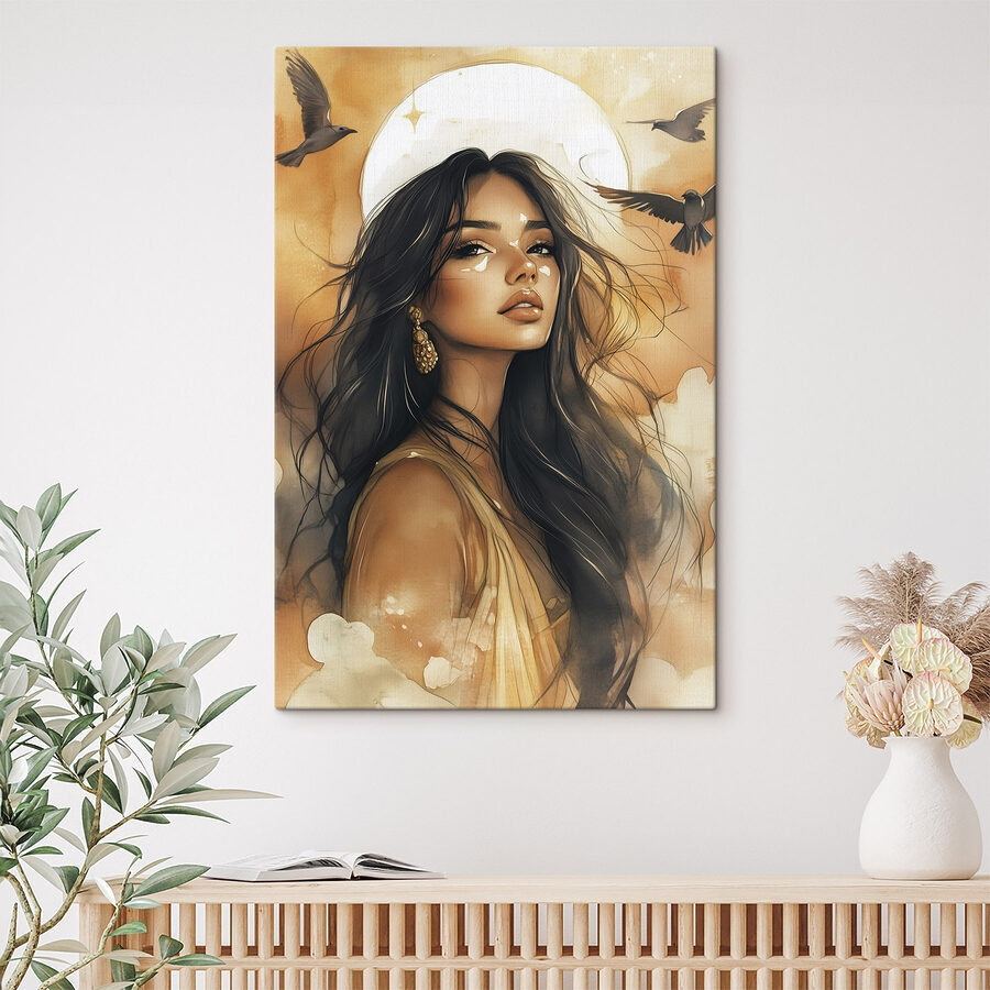 Transformați-vă spațiul cu această imprimare uimitoare pe pânză, care înfățișează o femeie cu părul vâlvoi și păsări înălțându-se pe cer. Este ca și cum ai surprinde un vis – într-un moment stă mândră, iar în următorul se lasă purtată de briză. Perfectă pentru oricine dorește o notă de natură amestecată cu un strop de farmec sufletesc, această piesă va stârni conversații și poate câteva vise cu ochii deschiși. Agățați-o într-un colț confortabil sau deasupra unei canapele elegante și priviți-o cum insuflă viață în orice cameră. Cine nu vrea puțină magie în casa sa?