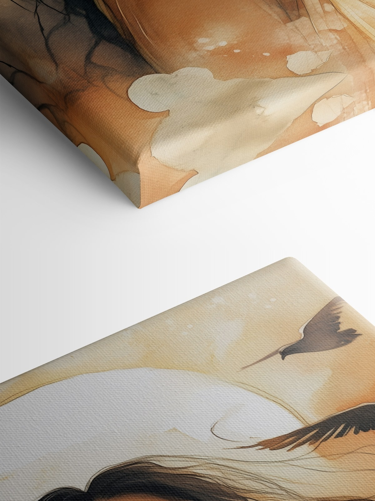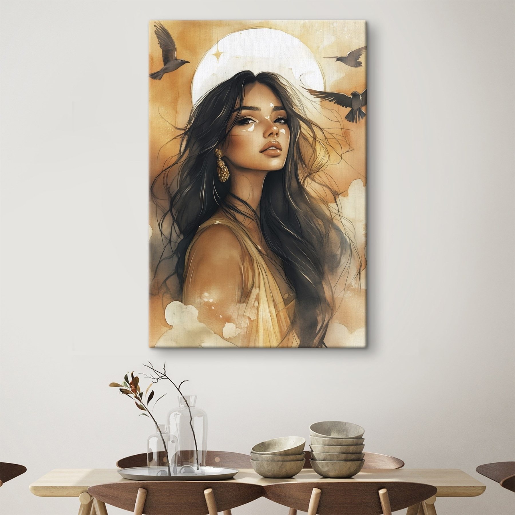 Transformați-vă spațiul cu această imprimare uimitoare pe pânză, care înfățișează o femeie cu părul vâlvoi și păsări înălțându-se pe cer. Este ca și cum ai surprinde un vis – într-un moment stă mândră, iar în următorul se lasă purtată de briză. Perfectă pentru oricine dorește o notă de natură amestecată cu un strop de farmec sufletesc, această piesă va stârni conversații și poate câteva vise cu ochii deschiși. Agățați-o într-un colț confortabil sau deasupra unei canapele elegante și priviți-o cum insuflă viață în orice cameră. Cine nu vrea puțină magie în casa sa?
