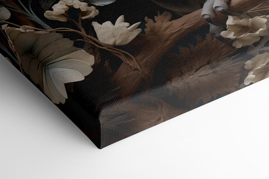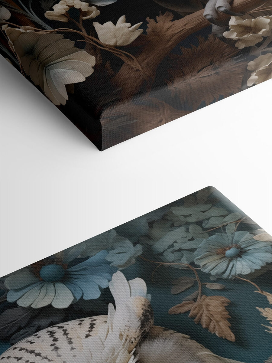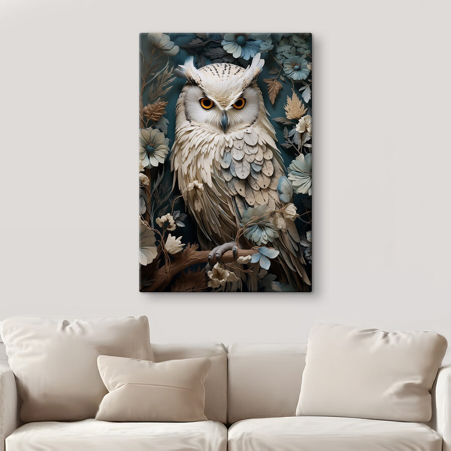 Faceți cunoștință cu această imprimare uimitoare pe pânză cu o bufniță albă înțeleaptă, cu ochi galbeni izbitori, cocoțată în mijlocul unor flori albastre delicate. Imaginați-vă-o în camera dvs. de zi și, dintr-o dată, spațiul dvs. va prinde viață cu un amestec de frumusețe naturală și farmec artistic. Fundalul albastru calm completează perfect florile vibrante, creând o atmosferă senină, dar captivantă.
