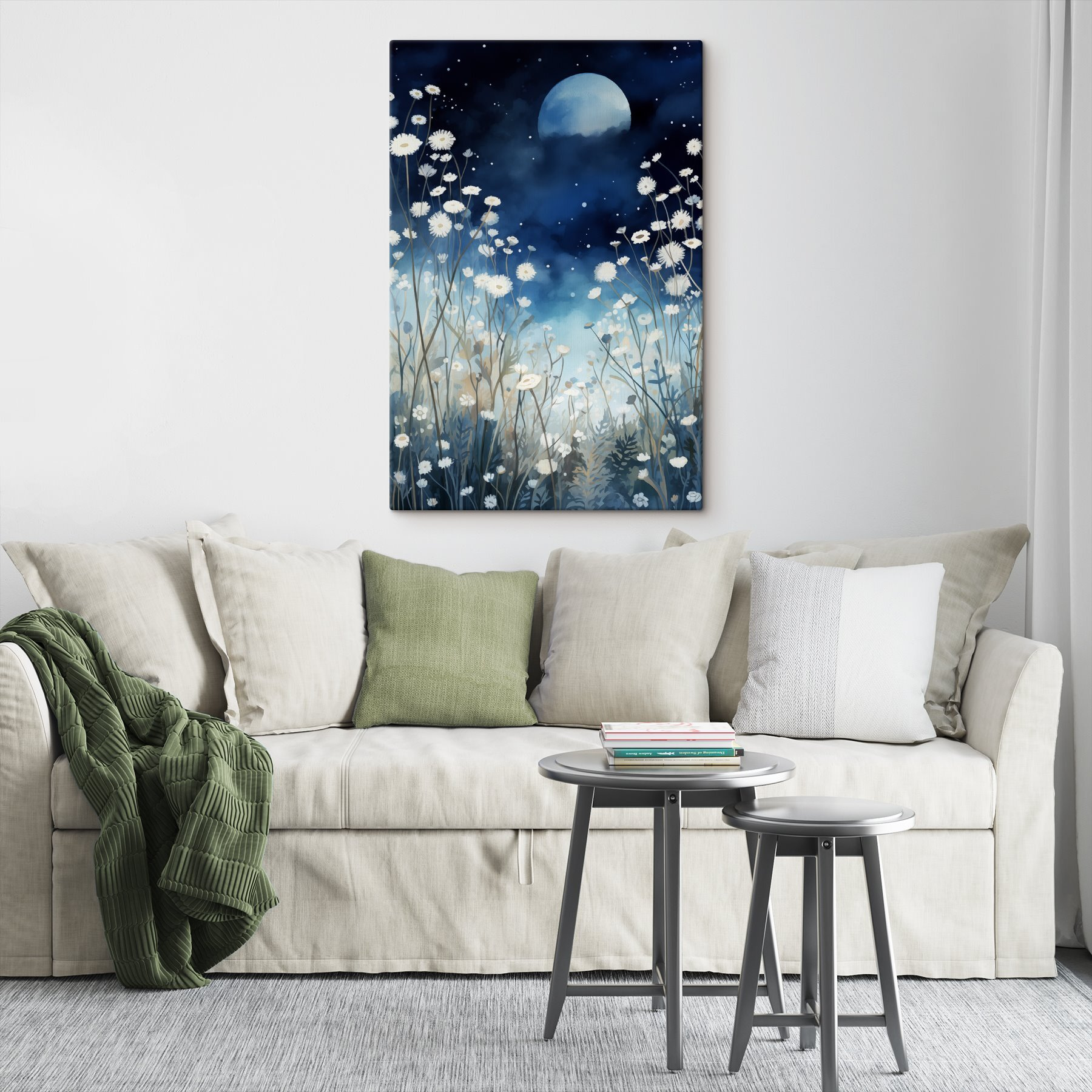 Transformați-vă spațiul cu această imprimare pe pânză încântătoare cu flori albe pe un cer nocturn de vis. Imaginați-vă că vă plimbați printr-o grădină luminată de lună, unde legănarea blândă a petalelor șoptește secretele naturii. Aceste flori delicate sunt ca niște steluțe presărate pe un fundal albastru moale, aducând un sentiment de calm și liniște. Perfectă pentru un colțișor de lectură confortabil sau ca piesă statement în camera de zi, această artă captează atât eleganță, cât și seninătate. Lăsați-o să inspire vise dulci și o atingere de magie a naturii în fiecare zi. Cine ar fi crezut că florile pot fura lumina reflectoarelor în acest fel?