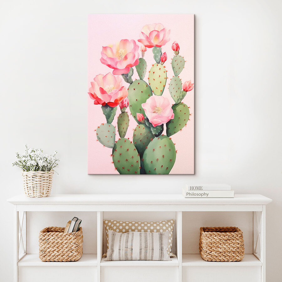 Transformați-vă spațiul cu această încântătoare imprimare pe pânză, cu un cactus vibrant împodobit cu flori înflorite. Este ca și cum ai aduce o bucată din deșert direct în sufrageria ta – fără înțepături! Nuanțele blânde de roz și verde creează o atmosferă plăcută, perfectă pentru a înveseli orice colț. Imaginați-vă sorbind cafeaua dimineața, bucurându-vă de căldura acestei lucrări de artă vesele. Are acel amestec plăcut de natură și farmec, în plus este o sursă excelentă de conversație – cine știa că cactușii pot arăta atât de fabulos? Adăugați o notă de frumusețe a naturii colecției dumneavoastră!