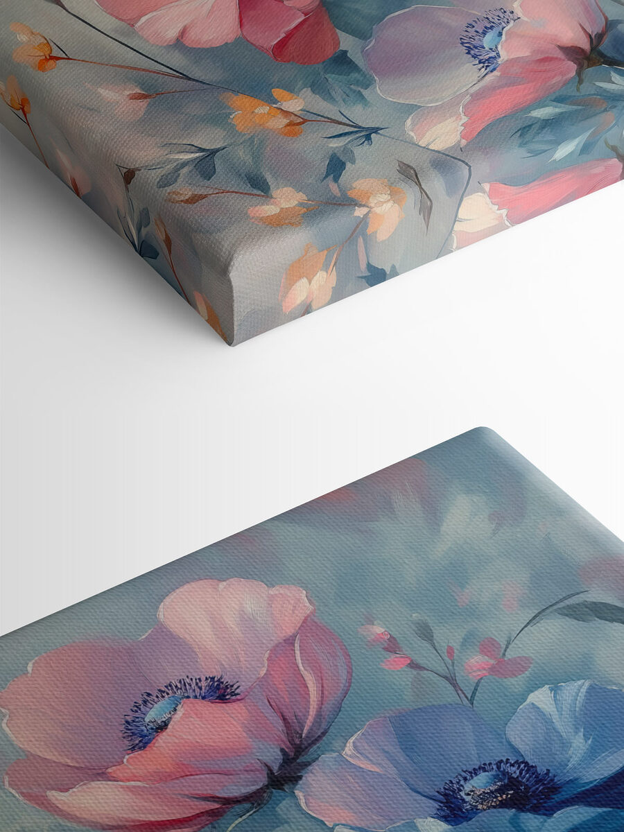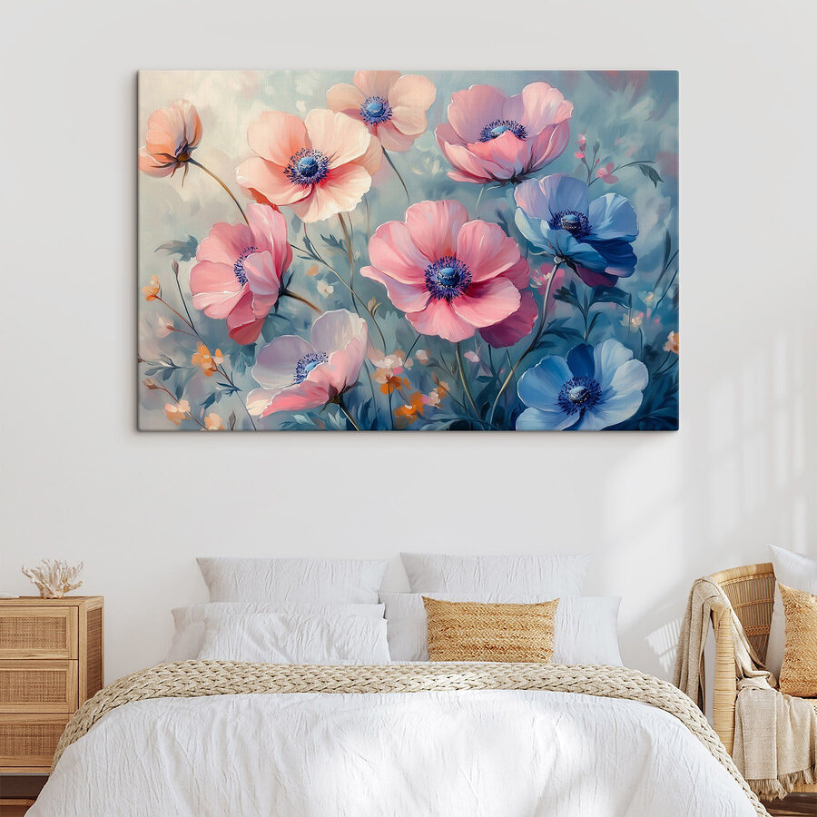 Înveseliți orice spațiu cu această imprimare uimitoare pe pânză, care prezintă un buchet de flori vesele dansând pe un fundal albastru liniștitor. Este ca și cum ai aduce o bucată de natură în casă, fără stropitoarea și albinele ocazionale. Nuanțele blânde și formele jucăușe creează o atmosferă primitoare, făcându-l perfect pentru sufragerie, dormitor sau chiar pentru un colț de lectură confortabil. Imaginați-vă că vă relaxați cu o ceașcă de ceai, înconjurați de aceste petale frumoase, simțind cum stresul se topește. Este o artă care șoptește căldură și confort – exact ceea ce aveți nevoie pentru un plus de fericire în viața de zi cu zi!