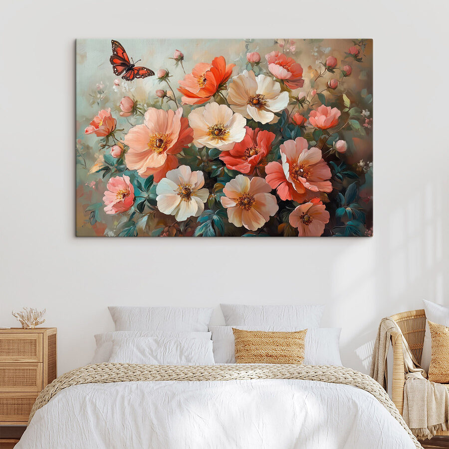 Înveseliți orice spațiu cu această imprimare superbă pe pânză cu un fluture alunecând peste un buchet uimitor de flori. Este ca și cum ai invita o mică bucată de natură chiar în casa ta. Culorile blânde și detaliile complicate atrag privirea, amintind de după-amiezele leneșe de vară petrecute într-o grădină, poate chiar cu o carte bună în mână – doar vibrația potrivită, nu-i așa? Perfectă pentru camera de zi, dormitor sau chiar un colț confortabil în care înflorește creativitatea. Este o piesă care stârnește bucurie și servește ca un memento blând al frumuseții naturii, transformând pereții într-o evadare veselă. Cine nu ar zâmbi la asta?