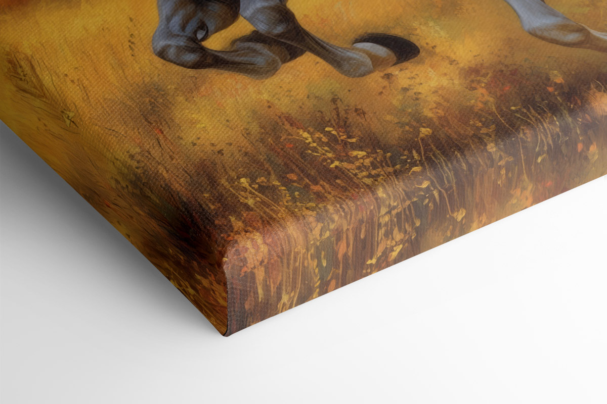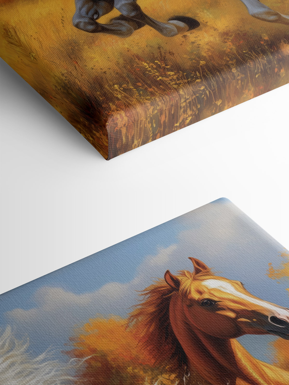 Imaginați-vă o după-amiază însorită, un câmp vast și un trio de cai maiestuoși care pornesc în galop, cu manelele lor curgând ca niște nori sălbatici. Această imprimare pe pânză surprinde acel moment exaltant, aducând un strop din frumusețea naturii chiar în spațiul dvs. Perfectă pentru iubitorii de animale sau pentru oricine dorește să adauge o notă vibrantă locuinței sale, are acel aer cald și primitor. Fie că este într-un living confortabil sau într-un studio creativ, vă va aminti de libertate și aventură. În plus, este un bun subiect de conversație – doar așteptați să curgă poveștile! O mică felie de natură, fără a fi nevoie de joacă.