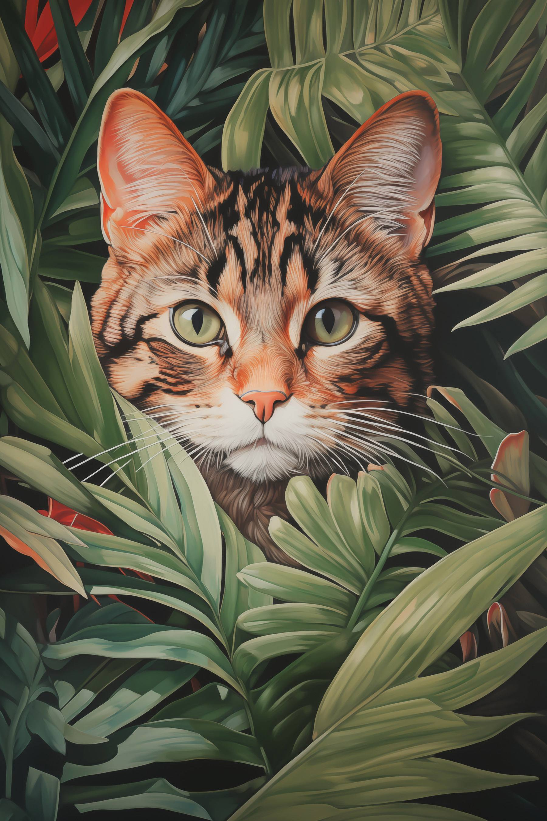 Transformați orice cameră într-o junglă plină de viață cu această imprimare pe pânză încântătoare “Cat in a Jungle”. Imaginați-vă-o – o felină curioasă care trage cu ochiul printre frunzele vibrante, cu ochii ei mari plini de răutăți și mirare. Este ca și cum ai avea o bucățică de natură chiar în spațiul tău de locuit, șoptindu-ți povești de aventură și liniște. Această operă de artă invită la zâmbete și stârnește conversații, fiind perfectă pentru oricine adoră animalele sau pur și simplu tânjește după un strop de sălbăticie. Agățați-o în sufrageria dvs. și dintr-o dată vă veți simți ca într-un colț confortabil, unde fiecare privire aduce o notă de bucurie. Atenție doar – acest mic explorator ar putea inspira visarea cu ochii deschiși!