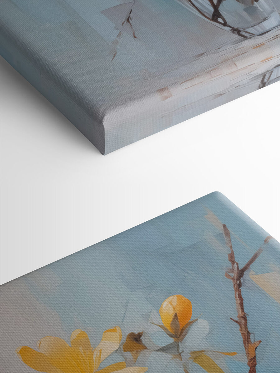 Înveseliți orice spațiu cu încântătorul print pe pânză “Flori galbene într-o vază de sticlă”. Este ca și cum ai avea o bucățică de vară pe tot parcursul anului! Imaginați-vă că intrați într-o cameră și sunteți întâmpinați de aceste flori minunate – serios, aproape că vă înfloresc în inimă. Galbenul vesel iese în evidență pe un fundal albastru liniștitor, creând o atmosferă primitoare și proaspătă.
