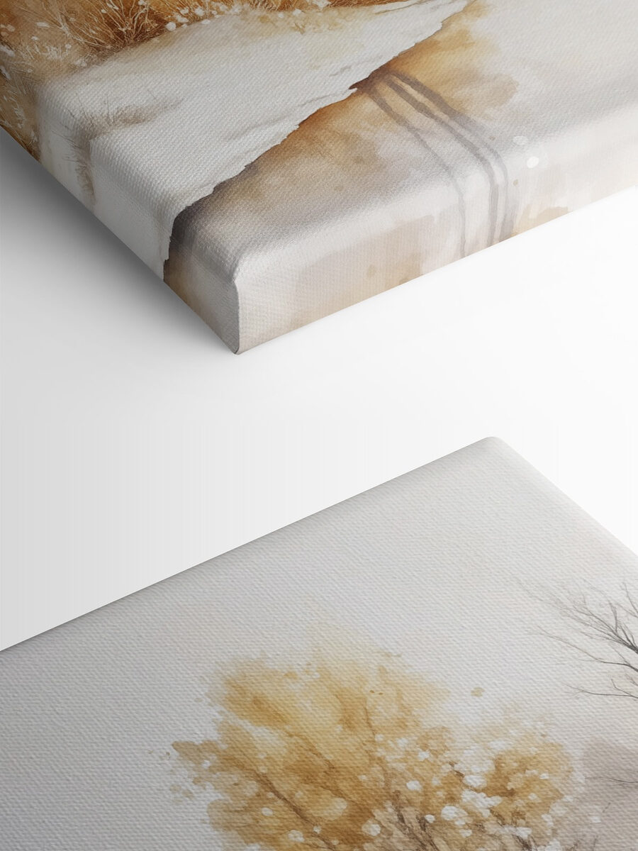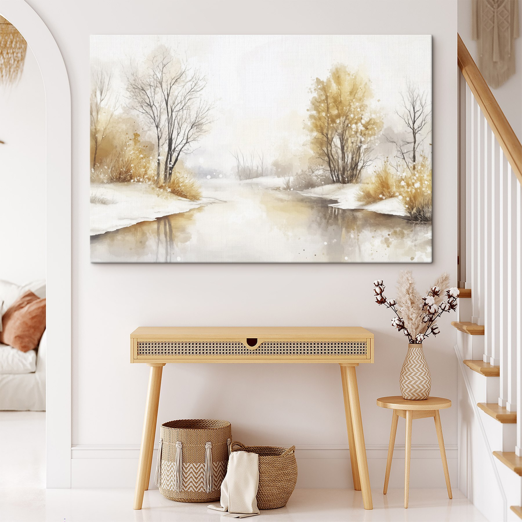 Imaginați-vă că vă așezați într-un colț liniștit, cu o cafea în mână, și vă lăsați privirea să se plimbe peste această pânză uimitoare de acuarelă a unui râu. Este ca și cum ai păși într-un vis blând în care copacii se leagănă ușor și zăpada șoptește secrete. Tonurile calde de pământ se îmbină fără efort cu alburile și griurile reci, creând o atmosferă senină care vorbește despre acele zile de iarnă în care vrei doar să hibernezi. Perfectă pentru a adăuga un strop din calmul naturii în orice spațiu, această piesă ar putea fi evadarea liniștită de care nu știai că ai nevoie. Credeți-mă, este un vis cu ochii deschiși minunat chiar pe peretele dvs.!