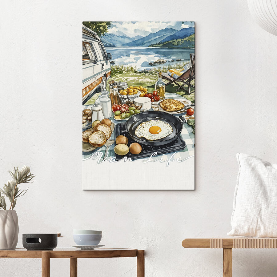 Pregătiți scena pentru spațiul dvs. cu această imprimare pe pânză, “Tablouri Table with food and a pan on it.” Imaginați-vă o dimineață pitorească pe malul lacului, cu o dubiță confortabilă și o masă apetisantă întinsă care vă așteaptă. Imaginați-vă mirosul de ouă proaspete care sfârâie în tigaie, fructele care strălucesc în lumina soarelui și bătaia blândă a apei din apropiere. Este ca o invitație la încetinire și la savurarea lucrurilor mărunte din viață. Această piesă de artă nu doar luminează un perete, ci stârnește bucurie, nostalgie și poate chiar dorința de a pleca într-un weekend. Perfectă pentru orice gurmand sau aventurier, această piesă plină de viață adaugă căldură, fantezie și o notă de dorință de a călători în orice cameră.