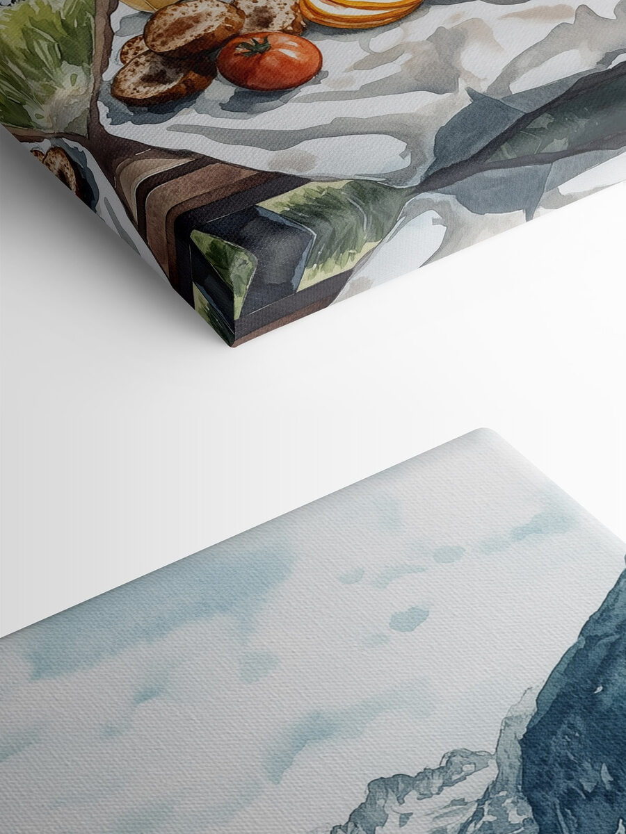 Transformați-vă spațiul cu această imprimare uimitoare pe pânză, “Mâncare pe o masă lângă un lac”. Imaginați-vă mirosul de ouă proaspete sfârâind în soarele dimineții, cu un lac pitoresc ca fundal. Este ca o mini evadare chiar pe peretele tău! Stilul acuarelă aduce căldură și seninătate, perfect pentru momentele confortabile sau adunările pline de viață. Imaginați-vă prietenii în jur, împărțind râsete și gustări, în timp ce frumusețea naturii îi înconjoară. Această piesă de artă este un memento blând pentru a savura plăcerile simple ale vieții. Cine nu și-ar dori o felie din asta?
