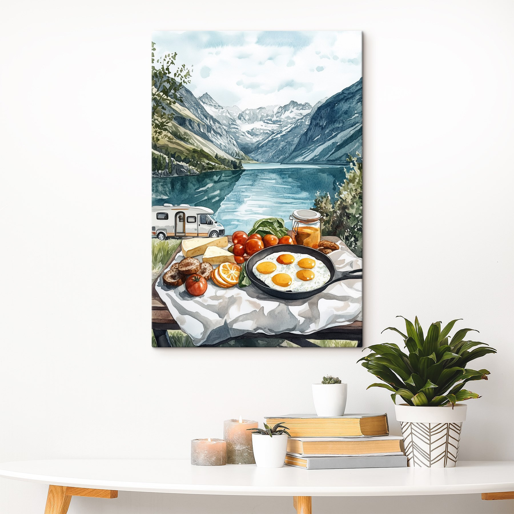 Transformați-vă spațiul cu această imprimare uimitoare pe pânză, “Mâncare pe o masă lângă un lac”. Imaginați-vă mirosul de ouă proaspete sfârâind în soarele dimineții, cu un lac pitoresc ca fundal. Este ca o mini evadare chiar pe peretele tău! Stilul acuarelă aduce căldură și seninătate, perfect pentru momentele confortabile sau adunările pline de viață. Imaginați-vă prietenii în jur, împărțind râsete și gustări, în timp ce frumusețea naturii îi înconjoară. Această piesă de artă este un memento blând pentru a savura plăcerile simple ale vieții. Cine nu și-ar dori o felie din asta?
