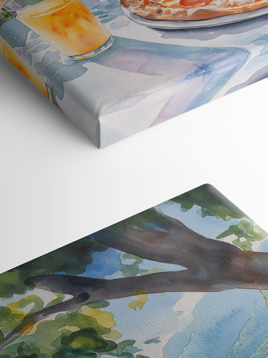 Imaginează-ți că te afunzi într-un colț confortabil al bucătăriei tale, cu aroma de pizza plutind în aer. Această pictură în acuarelă surprinde acel moment de vis – o felie delicioasă de pizza cu pepperoni combinată cu băuturi răcoritoare, totul pe fundalul apelor senine și al dealurilor luxuriante. Este acea evadare perfectă care face casa să se simtă ca o mică bucată de vacanță. Imaginează-ți-o atârnată pe perete, aducând căldură și bucurie spațiului tău. Fiecare privire ți-ar putea aminti de după-amiezele leneșe petrecute cu prietenii, râsetele bubuind ca băuturile carbogazoase. Nu este doar artă; este o felie de fericire cotidiană!