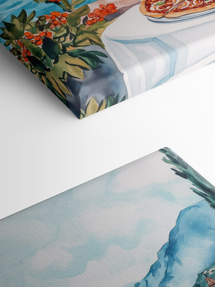 Imaginați-vă acest lucru: o scenă liniștită pe malul lacului, o masă pregătită pentru o masă delicioasă cu pizza tentantă și băuturi răcoritoare. Acest print acuarelă surprinde acel moment perfect. Îi invită pe toți cei care o văd să viseze la după-amiezi însorite, la râsete împărtășite la o porție de pizza și la legănarea blândă a copacilor în soare. Simțiți albastrul senin al lacului și munții din fundal – ca un loc de vacanță chiar în casa dvs. Nu este doar artă; este un bilet spre liniște, ceea ce o face un accesoriu fermecător pentru orice perete. Perfect pentru cei care adoră decorul unic!