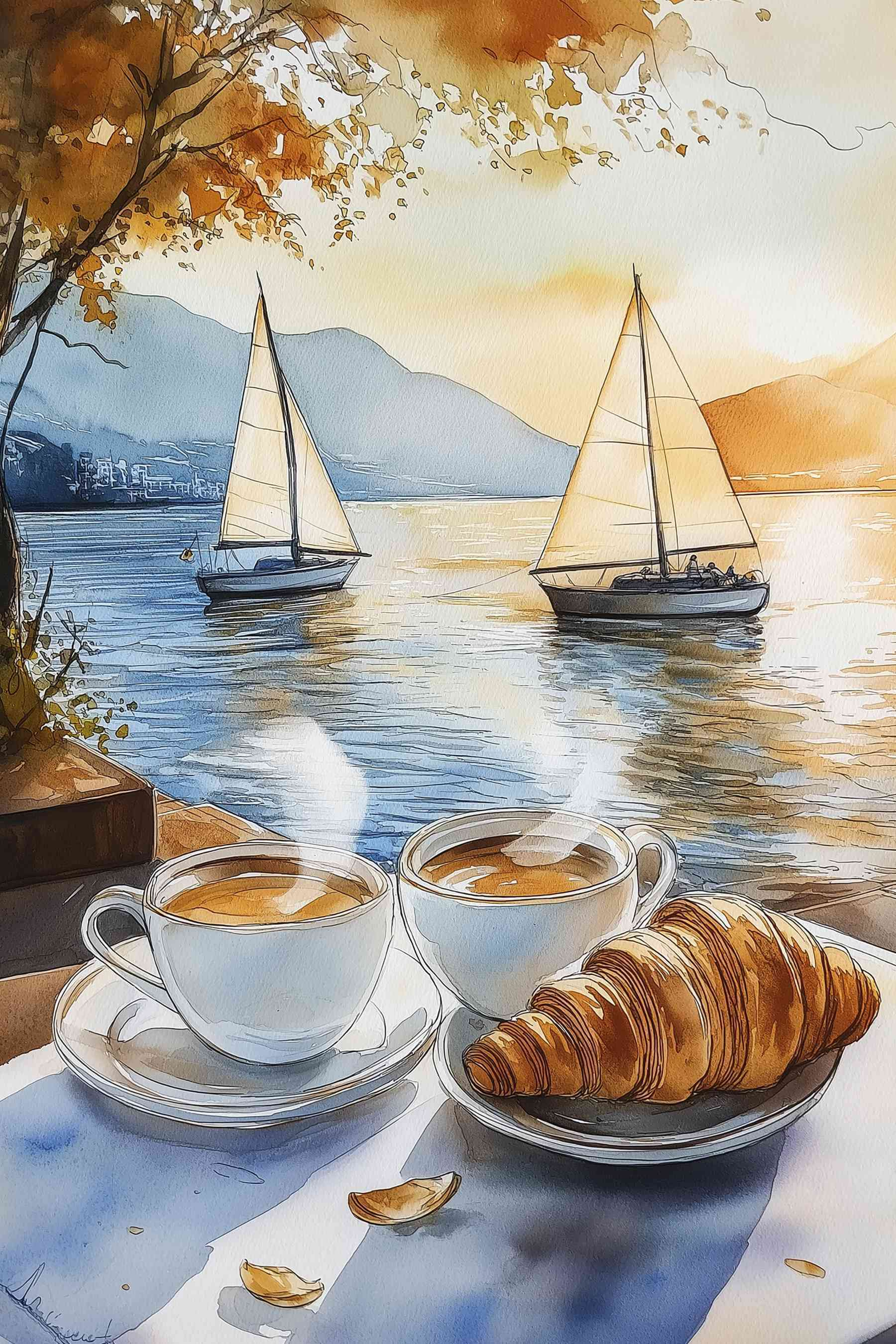 Înveselește-ți pereții cu această imprimare încântătoare pe pânză, care prezintă două cești aburinde de cafea și un croissant fărâmicios, toate amplasate într-o scenă liniștită de pe malul apei. Imaginați-vă că vă începeți ziua aici – lumina soarelui dansând pe apă și aroma reconfortantă de cafea umplând aerul. Este genul de atmosferă confortabilă care vă face să doriți să vă relaxați cu o carte bună sau să râdeți împreună cu un prieten. Perfectă pentru bucătării sau colțuri pentru micul dejun, această operă de artă invită la căldură și conversație. În plus, cui nu-i place puțină inspirație de croissant? Aduceți un gust de beatitudine de cafenea în casa dvs.!