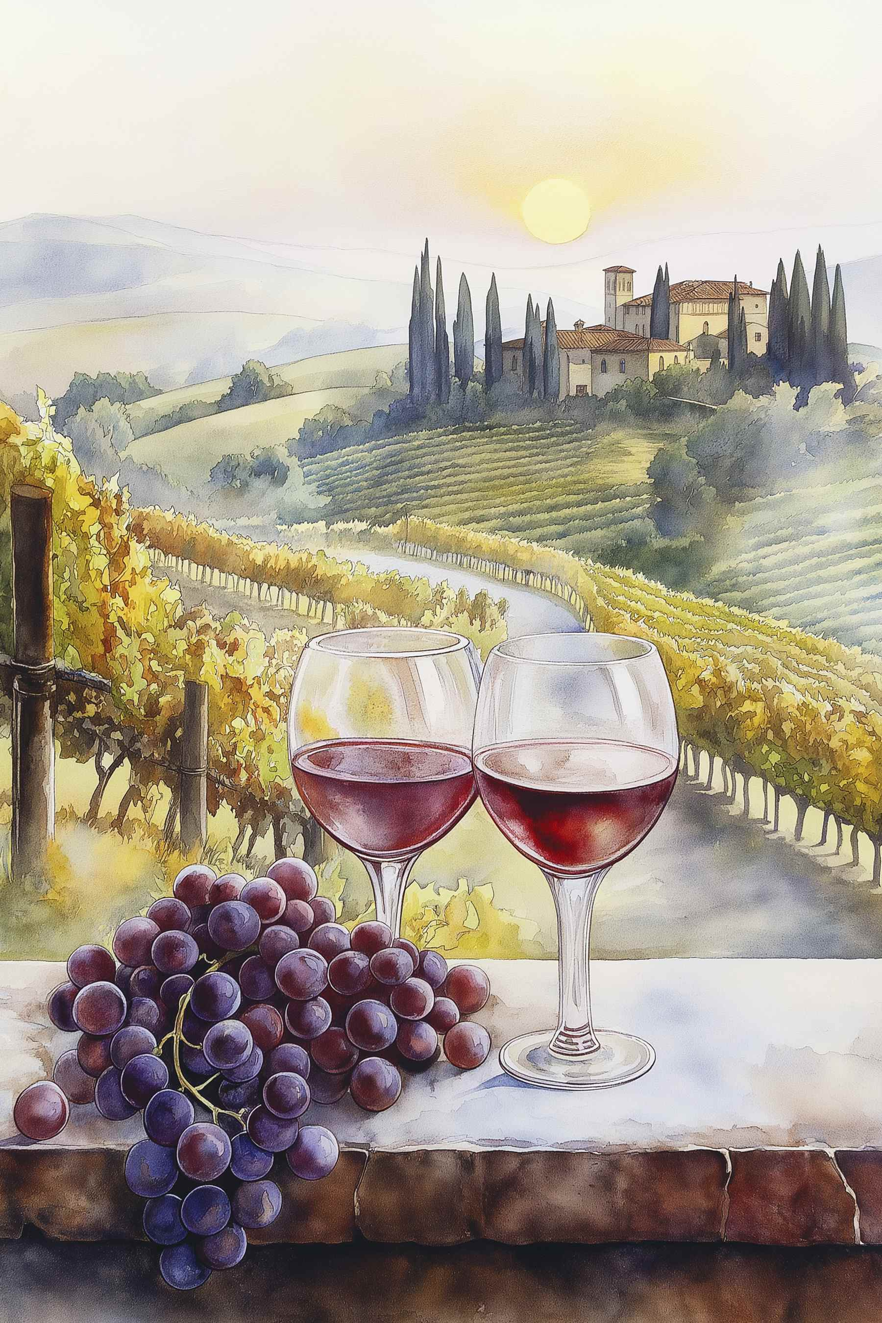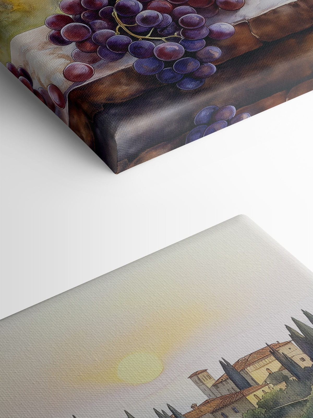 Transformați orice perete plictisitor într-o atmosferă confortabilă de podgorie cu această imprimare pe pânză în acuarelă cu pahare de vin drăguțe și struguri plini. Imaginați-vă sorbind un Merlot bun în timp ce această artă vă poartă într-o evadare de vis în podgorii însorite, unde aerul este plin de mirosul dulce de struguri coapte și râsete suave. Este ca și cum ai aduce o felie din Italia chiar în casa ta! Perfectă pentru colțurile de luat masa sau pentru o mică zonă de bar chic, această piesă adaugă un strop de culoare și farmec. Cine nu s-ar simți un pic elegant în timp ce savurează următorul pahar de vin lângă o astfel de frumusețe?