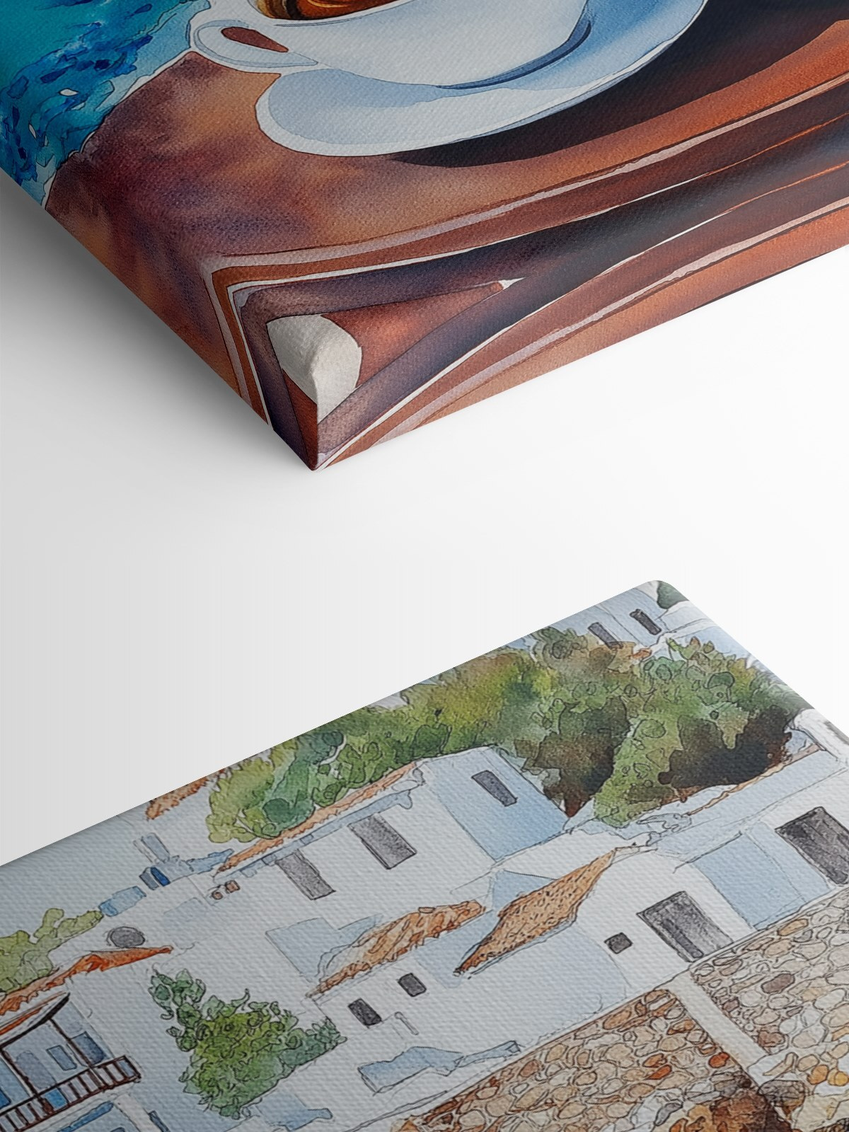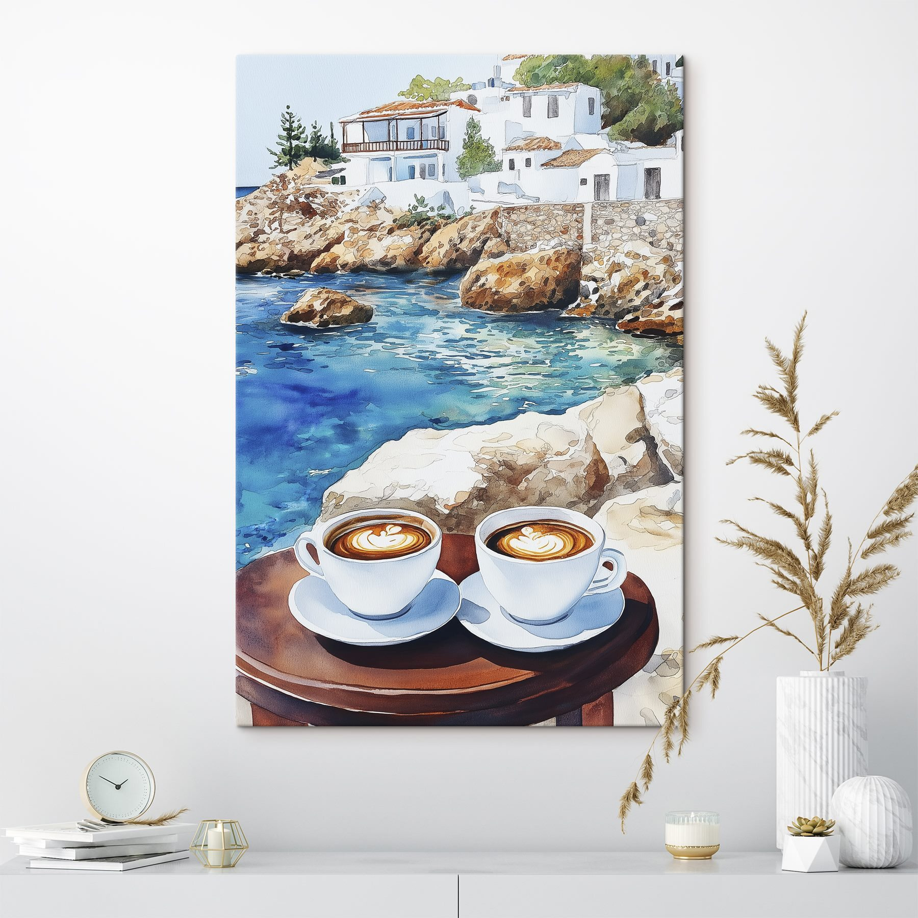 Imaginați-vă că vă așezați în colțul dvs. preferat și aruncați o privire la o imprimare pe pânză vibrantă a două cești aburinde de cafea, așezate pe o masă lângă un corp de apă senin. Marourile bogate ale cafelei dansează jucăuș împotriva apei albastre strălucitoare, trăgându-vă într-un vis cu ochii deschiși la soare și valuri blânde. Imaginați-vă – lumina dimineții care se revarsă în timp ce aroma de cafea umple aerul. Această piesă este mai mult decât un decor; este o invitație de a sorbi și de a te relaxa, de a împărtăși momente liniștite cu un prieten sau pur și simplu de a savura un pic de singurătate. Perfect pentru spațiile care au nevoie de un strop de căldură și farmec!