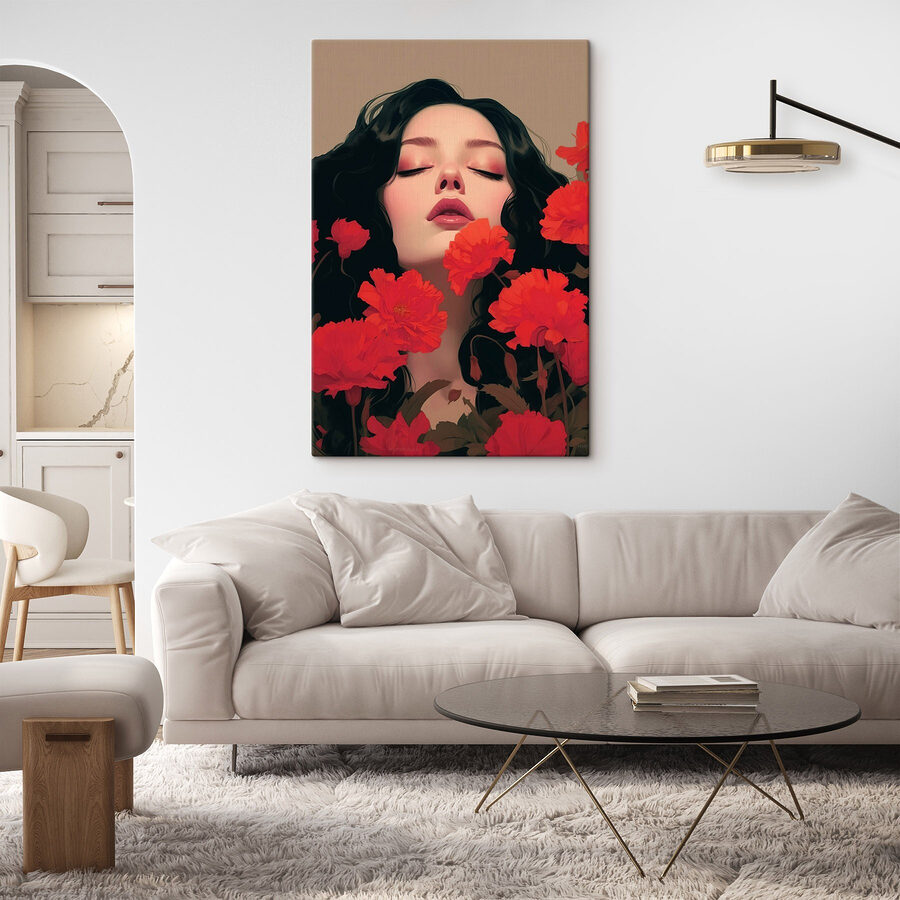 Imaginați-vă că intrați într-o cameră și sunteți întâmpinați de o imprimare uimitoare pe pânză care înfățișează o femeie cu păr negru, lung și fluid, complet învăluită de flori roșii vibrante. Este ca și cum ai păși într-un vis, unde culorile pulsează cu viață, iar fiecare petală pare să șoptească un secret. Această piesă armonizează frumusețea naturii și profunzimea emoțiilor, făcând-o perfectă pentru un living confortabil sau un dormitor senin. O singură privire la ea și grijile zilei se topesc, lăsând doar pace și inspirație. Nu este doar artă; este un sentiment – ca o îmbrățișare caldă într-o zi friguroasă. Adaugă un strop de farmec îndrăzneț spațiului tău și lasă pereții tăi să vorbească!
