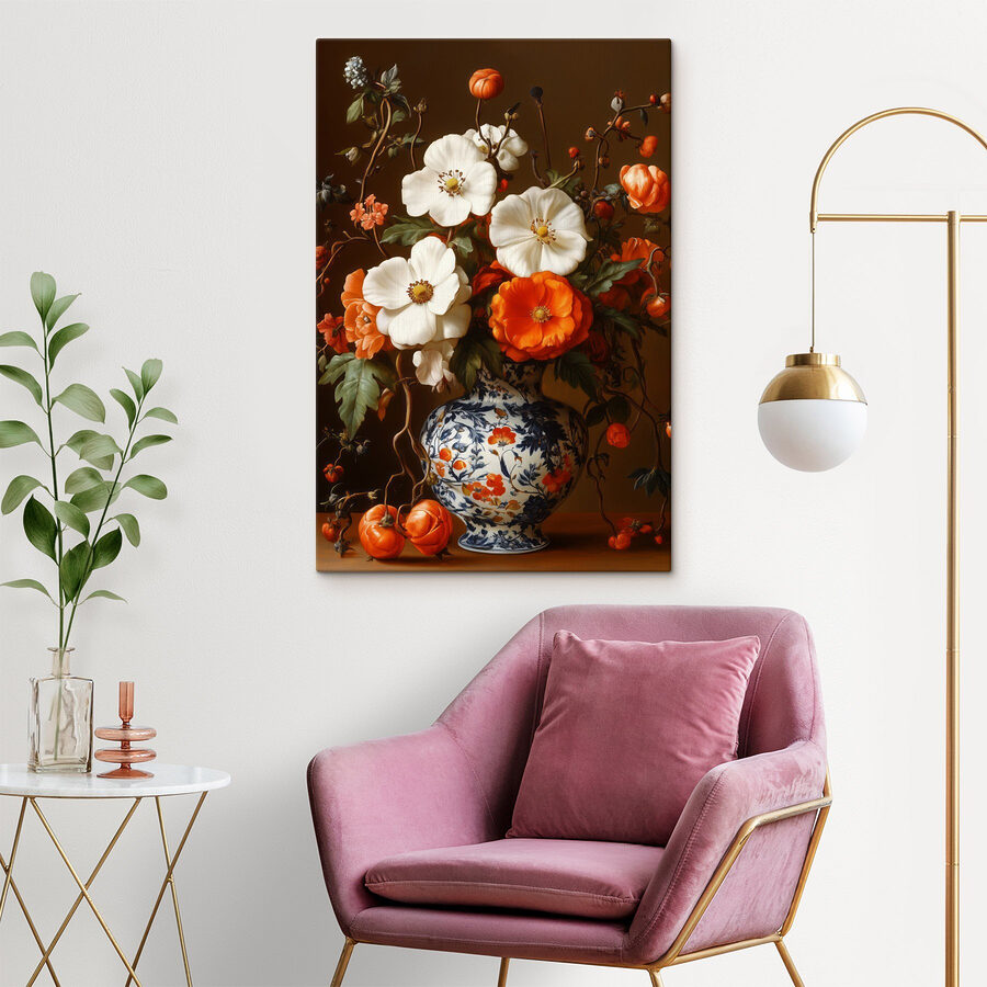 Înveseliți orice cameră cu această imprimare uimitoare pe pânză de flori într-o vază! Este ca și cum ai aduce o grădină veselă în interior, fără polenul supărător. Portocalele și alburile vibrante ies în evidență pe fundalul confortabil, făcând imposibil să nu zâmbești. Imaginați-vă sorbindu-vă cafeaua în timp ce admirați această frumusețe – este ca și cum ați avea un pic de natură chiar acolo, fără murdărie. Perfectă pentru o cameră de zi sau un colț confortabil, această piesă spune o poveste de căldură și o notă de eleganță. Cine ar fi crezut că florile pot fi atât de vii? Adăugați un strop de bucurie pereților dvs. și priviți cum înfloresc complimentele!