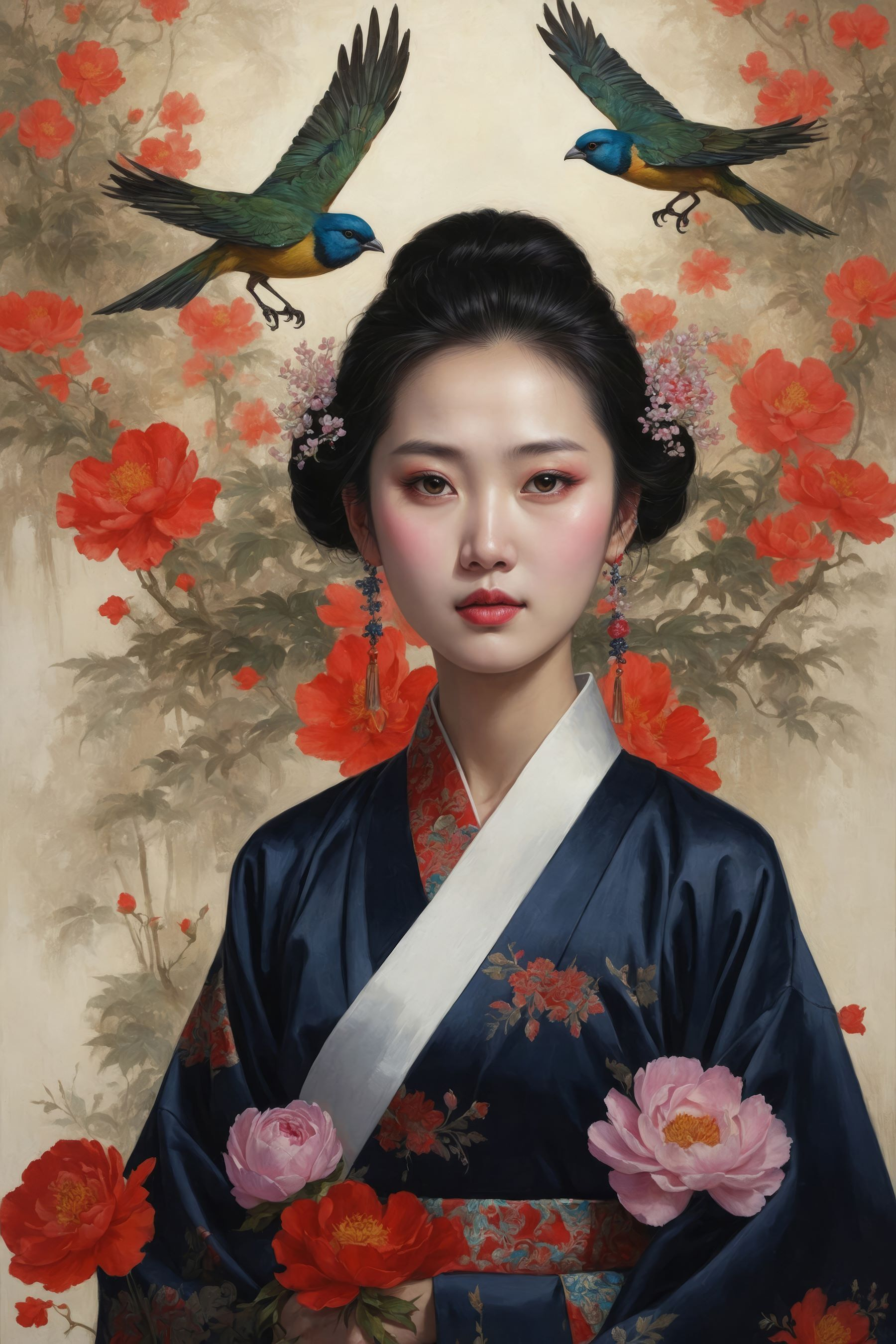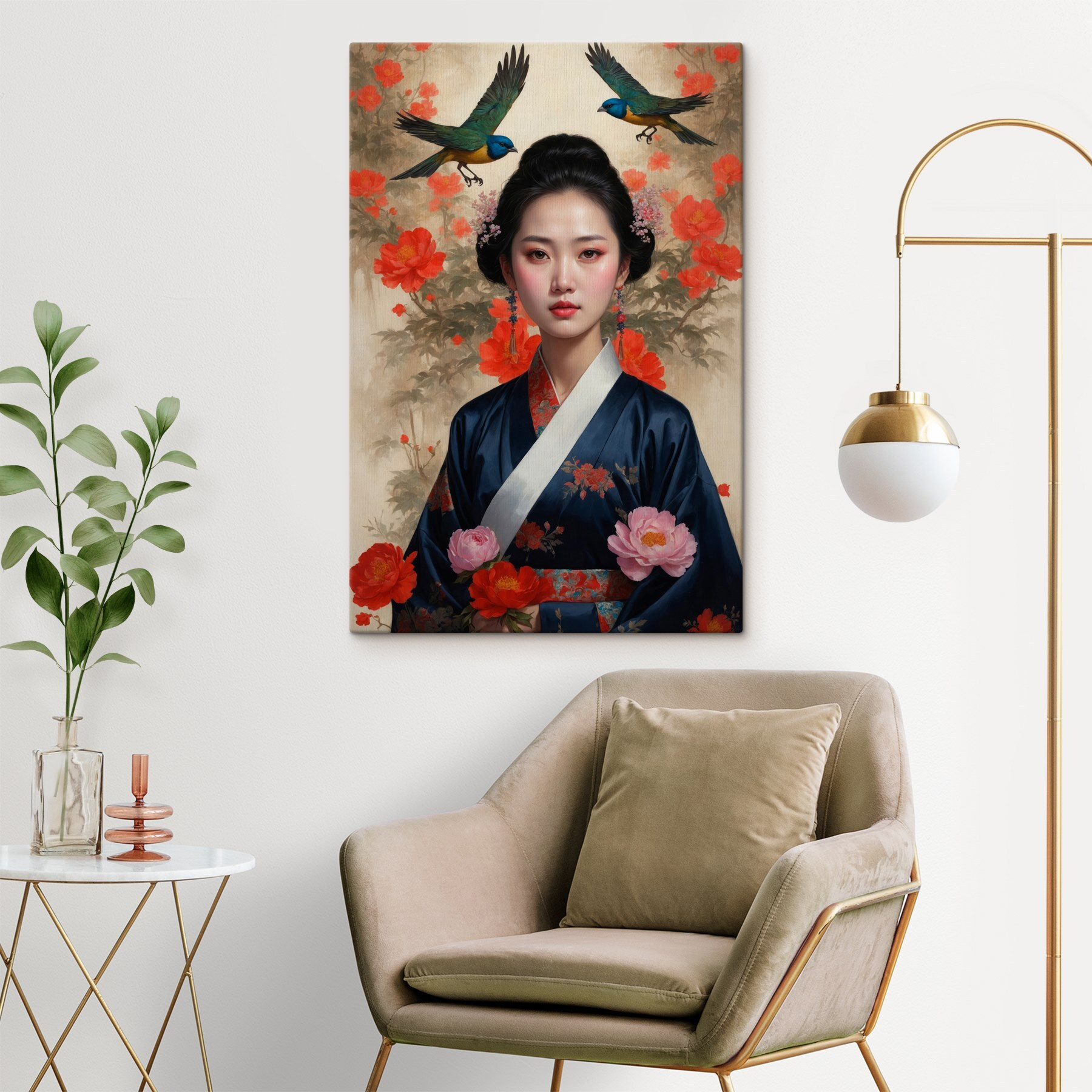 Transformați-vă spațiul cu această imprimare uimitoare pe pânză a unei femei în kimono, înconjurată de flori vibrante și păsări grațioase. Culorile sar practic de pe pânză, aducând viață și eleganță în orice cameră. Imaginați-vă această piesă ca un starter de conversație în timpul întâlnirilor sau un fundal liniștit în timpul acelor momente de liniște cu o ceașcă de ceai. Este ca și cum ai avea o mini-vacanță într-o grădină liniștită, chiar la tine acasă! Perfect pentru oricine iubește frumusețea naturii amestecată cu un strop de farmec cultural. Credeți-ne, pereții dvs. vă vor mulțumi!