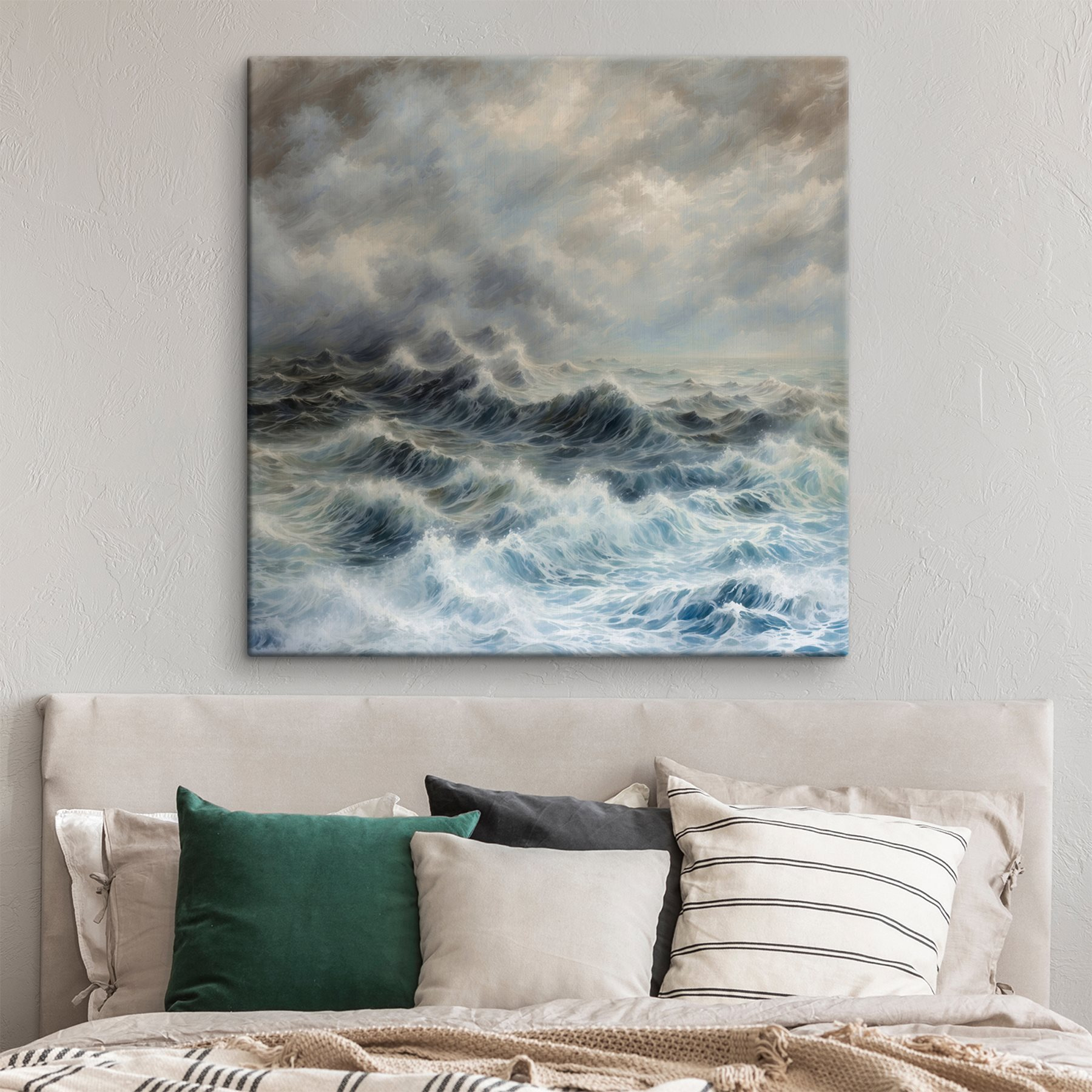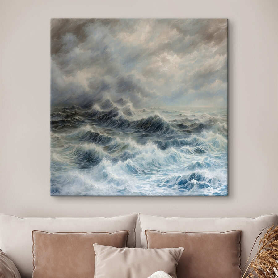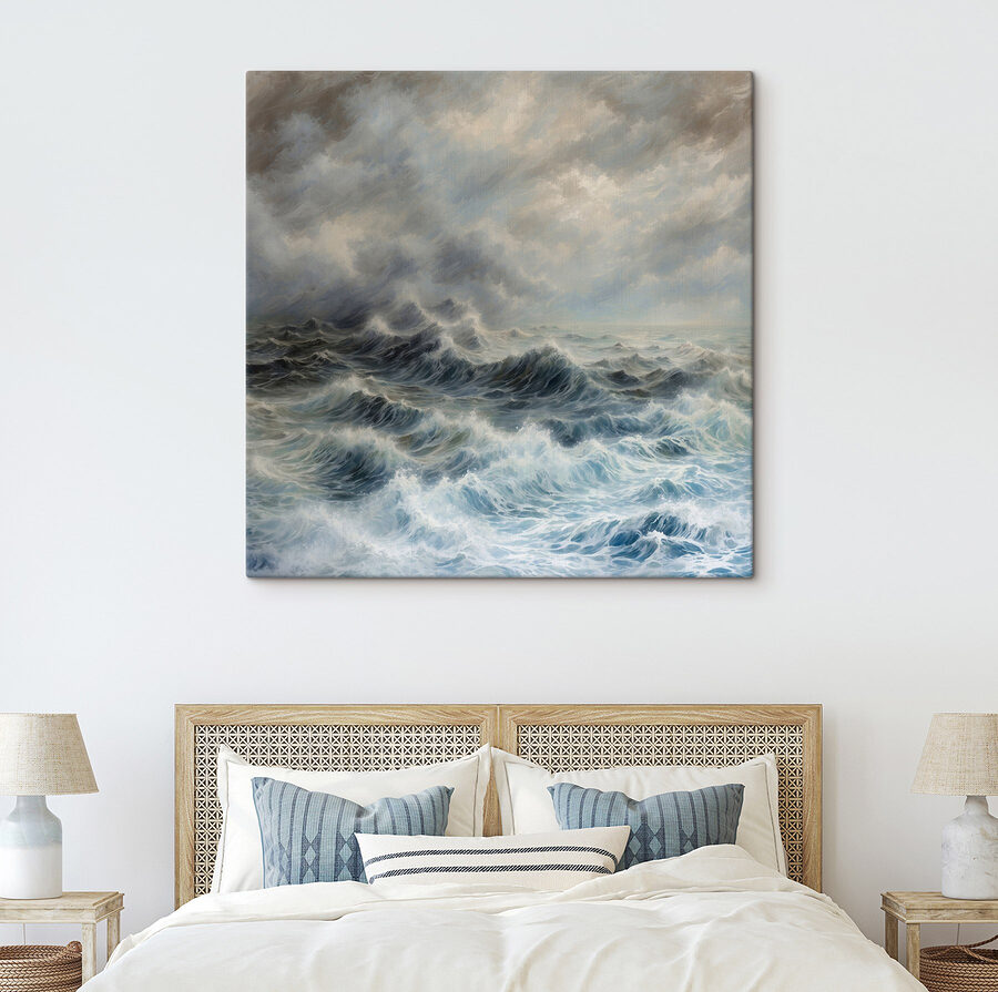 Aduceți vibrațiile liniștitoare ale oceanului direct în spațiul dvs. de locuit cu această imprimare uimitoare pe pânză care prezintă valuri maiestuoase dansând sub o pătură de nori. Imaginați-vă că vă așezați în fotoliul preferat, cu o băutură caldă în mână, în timp ce vă pierdeți în această evadare acvatică. Albastrul blând și griurile subtile evocă o retragere liniștită, aproape făcându-vă să simțiți briza blândă a oceanului. Perfectă pentru a crea o atmosferă calmă, este ca o mini-vacanță de fiecare dată când treci pe lângă ea. Agățați-o și lăsați valurile să vă ducă grijile departe – pentru că cine nu și-ar dori o bucățică de mare în casa sa?