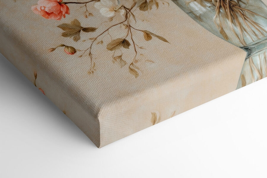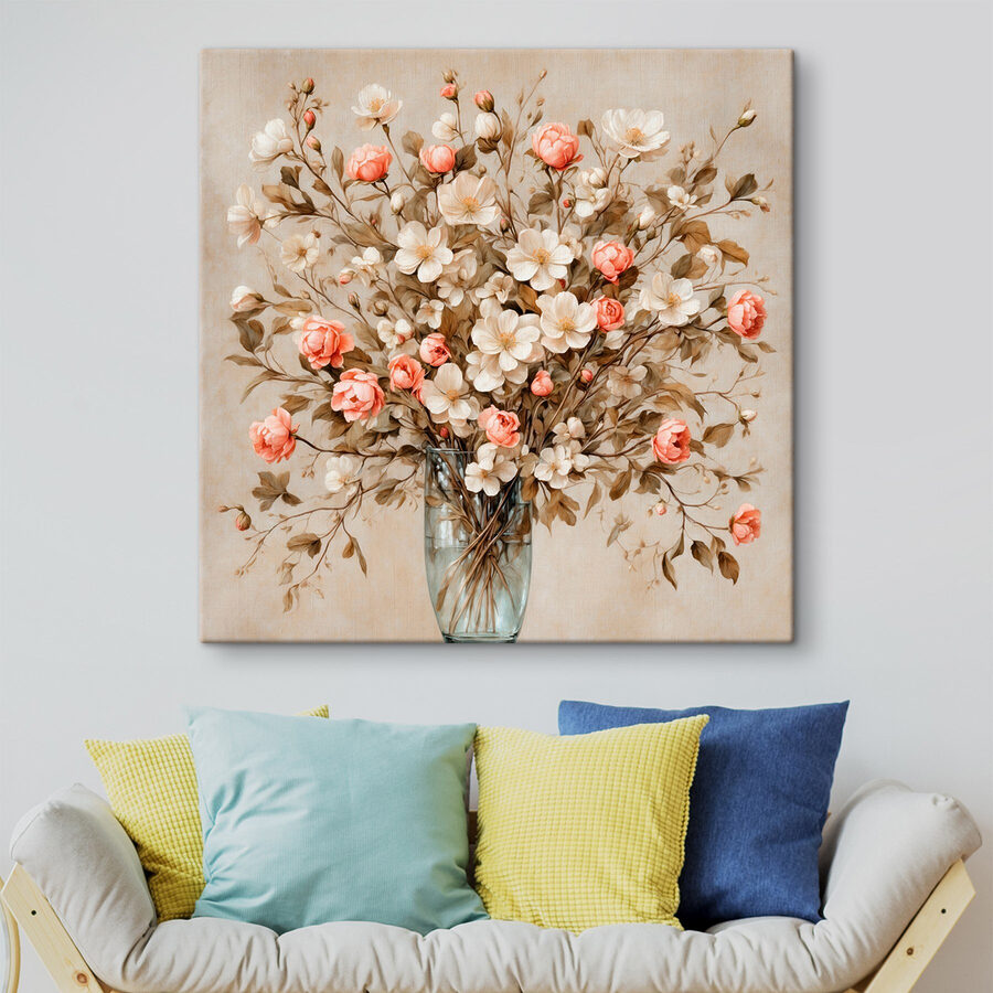 Înveselește-ți spațiul cu această imprimare uimitoare pe pânză cu flori într-o vază. Imaginați-vă intrând într-o cameră și fiind întâmpinați de această încântătoare explozie de flori – perfectă pentru acele zile în care aveți nevoie de puțină veselie în plus. Nuanțele blânde de roz și crem dansează împreună, aducând o atingere a frumuseții naturii în interior, fără polen (slavă Domnului).