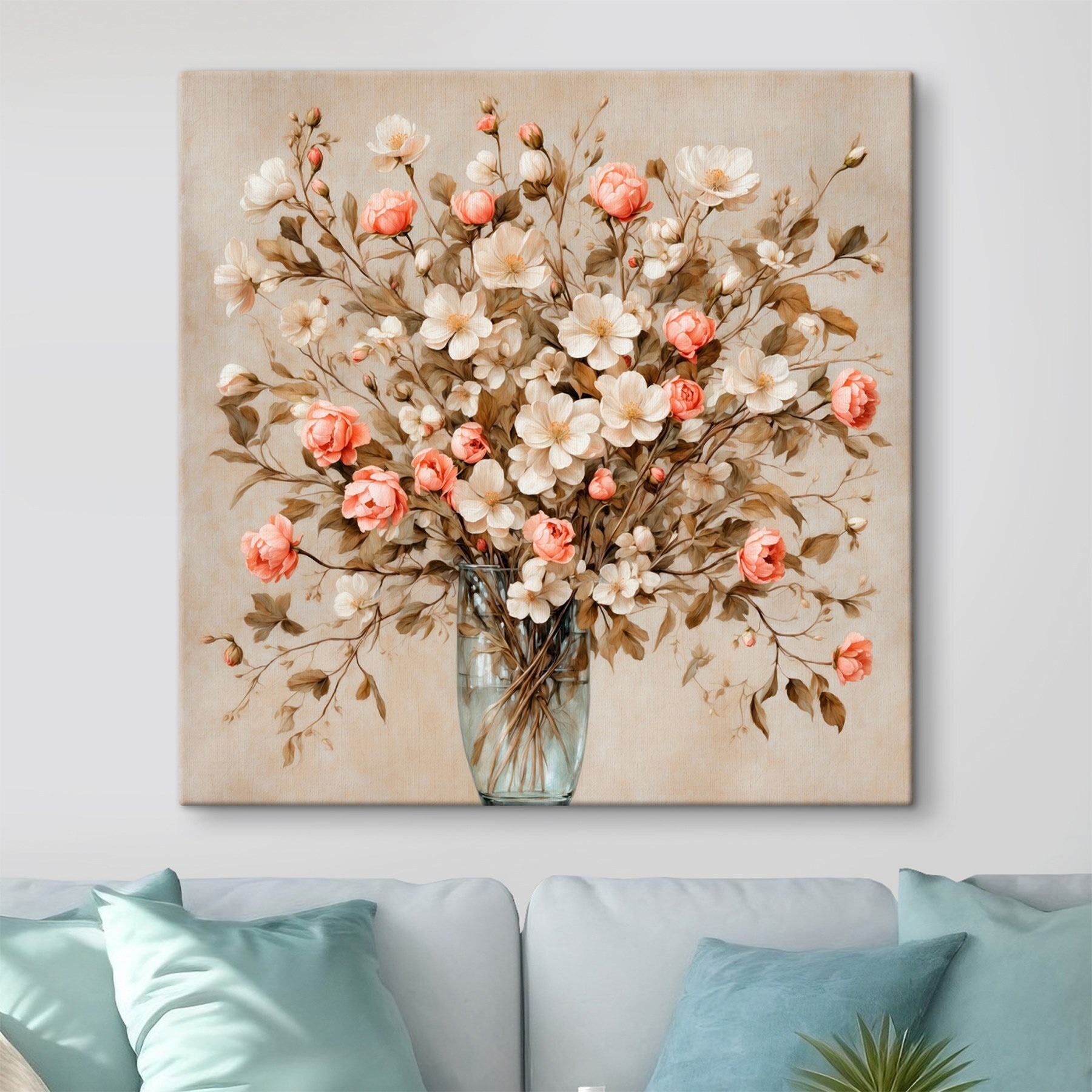 Înveselește-ți spațiul cu această imprimare uimitoare pe pânză cu flori într-o vază. Imaginați-vă intrând într-o cameră și fiind întâmpinați de această încântătoare explozie de flori – perfectă pentru acele zile în care aveți nevoie de puțină veselie în plus. Nuanțele blânde de roz și crem dansează împreună, aducând o atingere a frumuseții naturii în interior, fără polen (slavă Domnului).