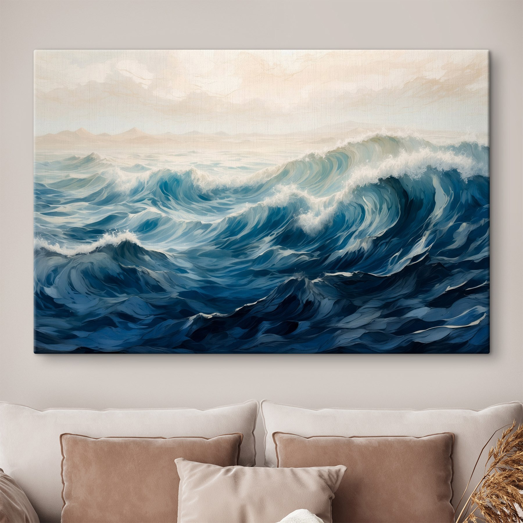 Imaginați-vă acest lucru: valuri care se sparg și se învârt, capturând toată dramatismul oceanului chiar în camera dvs. de zi. Cu “Valuri mari în ocean”, fiecare privire se simte ca o mini-vacanță. Albastrul vibrant și cremele moi din această pânză fac imposibil să nu visezi cu ochii deschiși la briza oceanului și la plajele nisipoase. Este perfect pentru oricine dorește să împrăștie un pic din minunăția naturii în spațiul său. Imaginați-vă că vă relaxați cu o carte bună, o ceașcă de ceai și vă lăsați fermecați de aceste valuri hipnotizante. Nu este doar artă; este un stimulent pentru starea de spirit, o sursă de conversație și un mic memento al frumuseții mării, fără a face o baie.